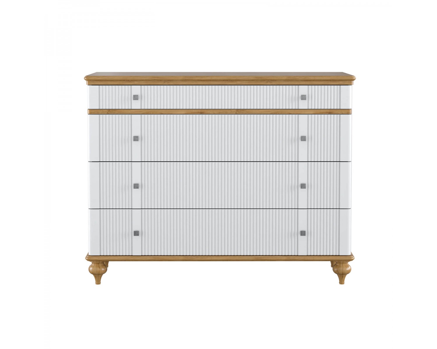 Комод оснащен четырьмя ящиками. Фурнитура на ящиках с доводчиками. Высокие ножки обеспечивают оптимальный доступ при уборке.