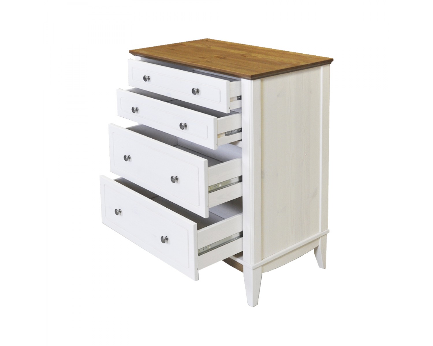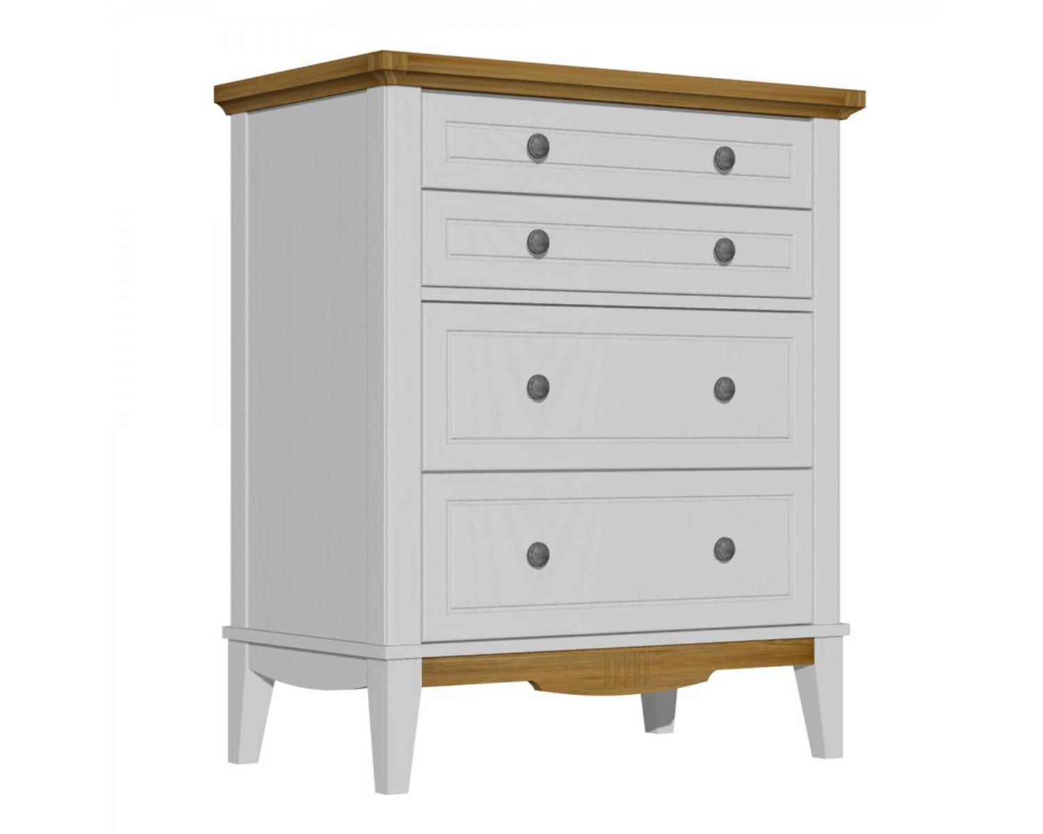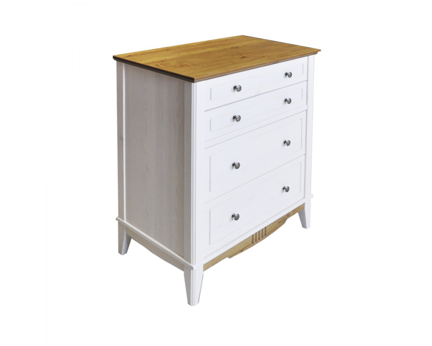 Корпус комода выдержан в мягком белом тоне (RAL 7046), крышка и нижняя декоративная планка окрашены в тёплый цвет антик, через который просвечивает текстура дерева. Донья ящиков сделаны из оргалита белого цвета, стенки ящиков окрашены в цвет корпуса.
