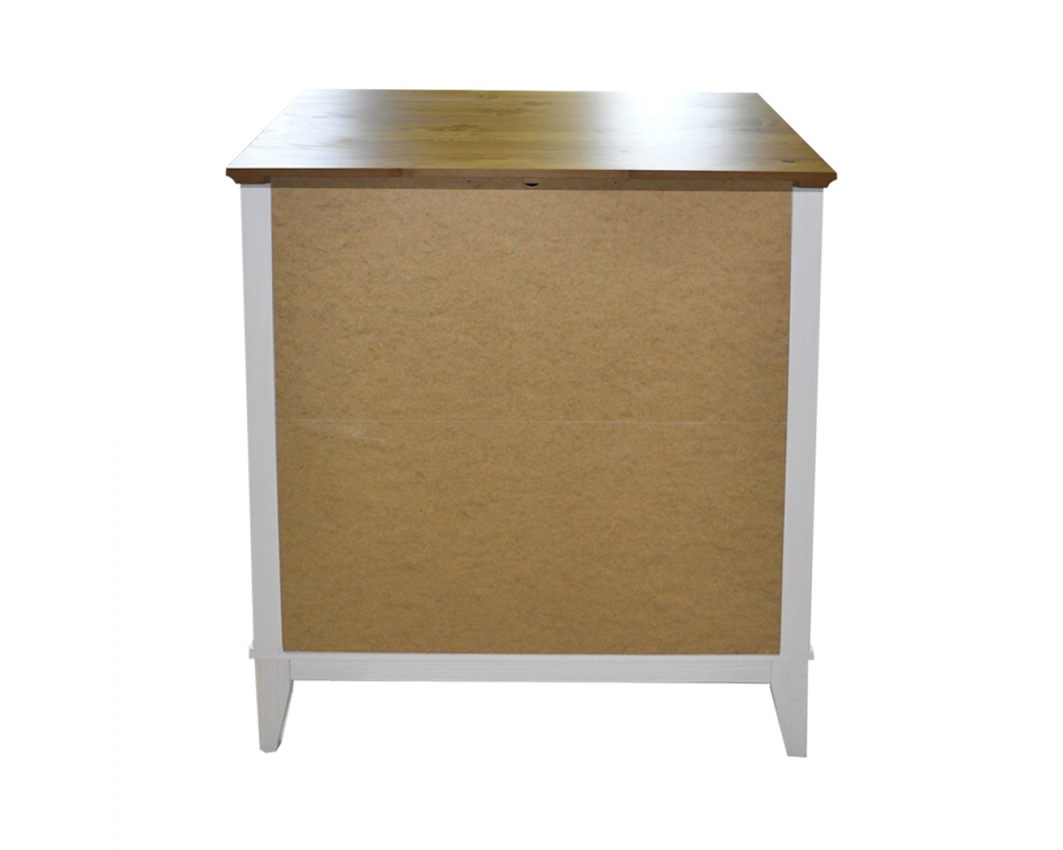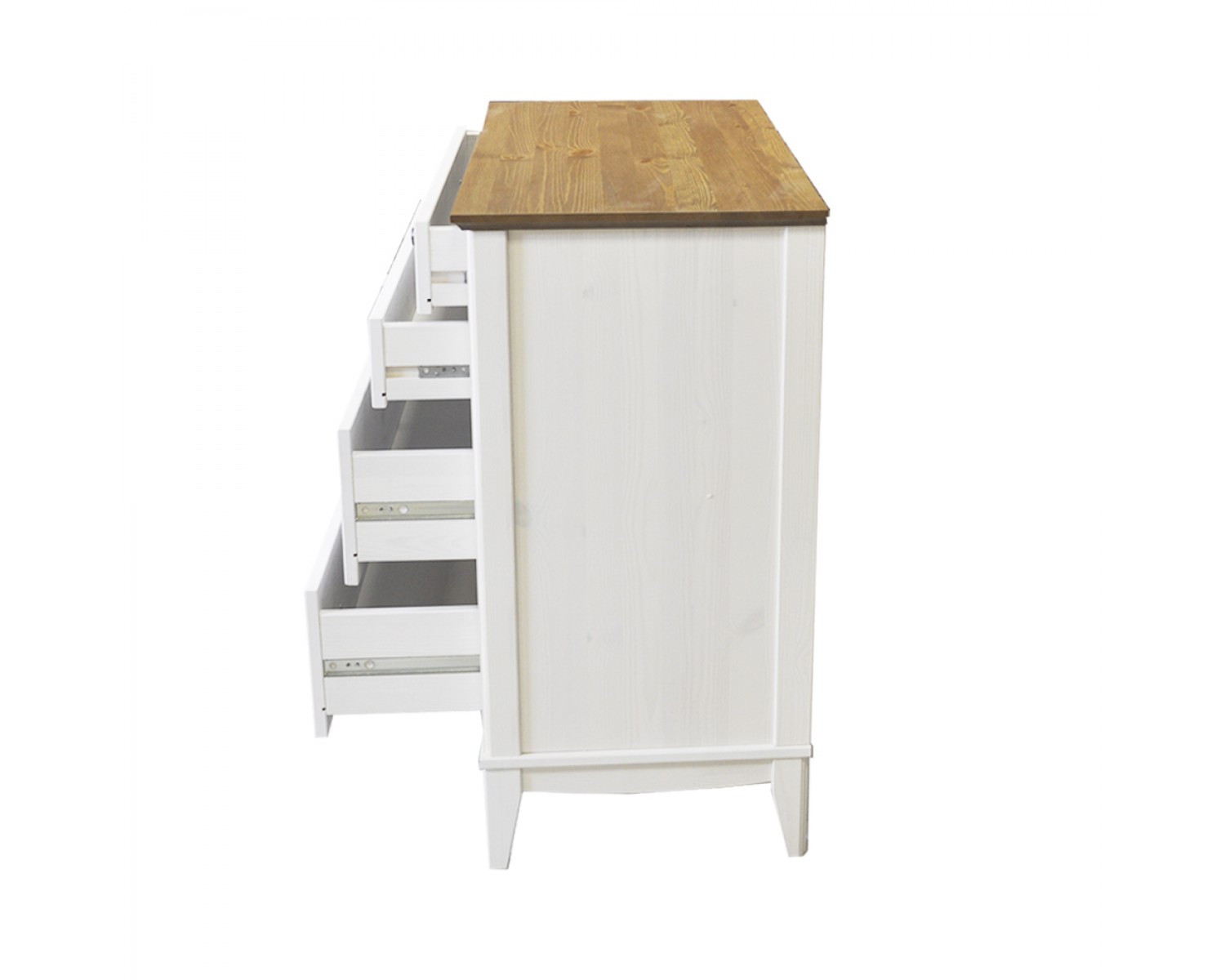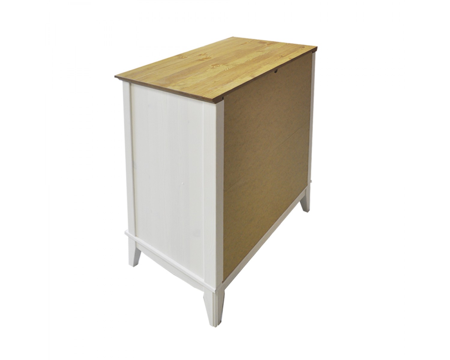 Корпус комода выдержан в мягком белом тоне (RAL 7046), крышка и нижняя декоративная планка окрашены в тёплый цвет антик, через который просвечивает текстура дерева. Донья ящиков сделаны из оргалита белого цвета, стенки ящиков окрашены в цвет корпуса.