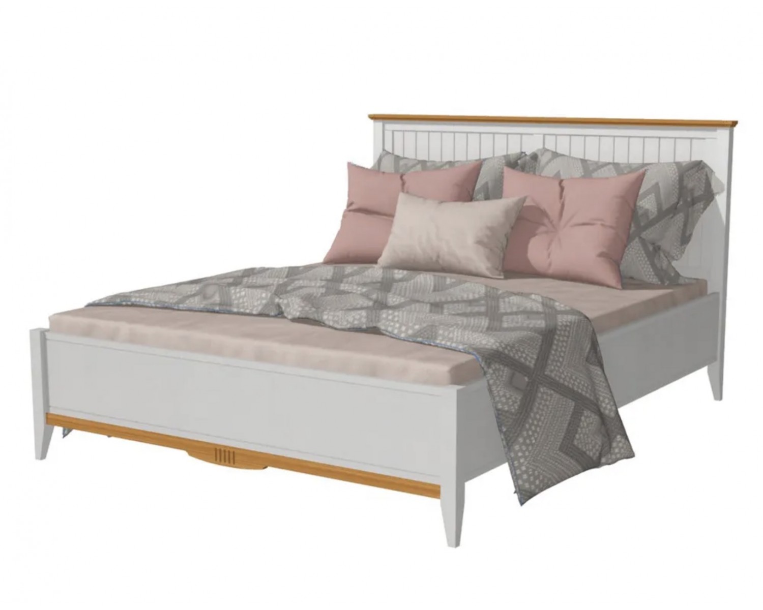 В дизайне кровати гармонично объединены два цвета: корпус окрашен в белый цвет, а декоративные детали изголовья и изножья в цвет антик, через который видна красивая древесная текстура. Для любителей темных тонов предлагается такая же модель, но в отделке «серый/антик». Кровать «Пенни» станет центральным элементом спальни в скандинавском, классическом стиле или в стиле прованс.
