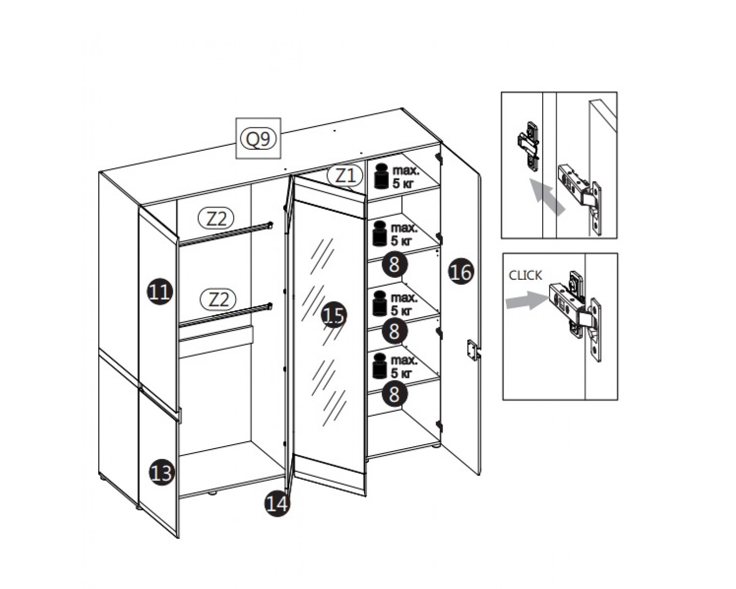 Шкаф 4D/TYP 23A Линате имеет две секции с штангой и секцию с полками.