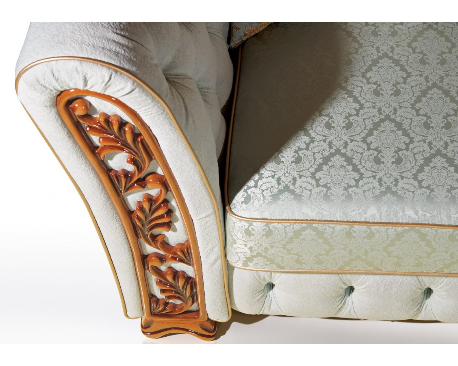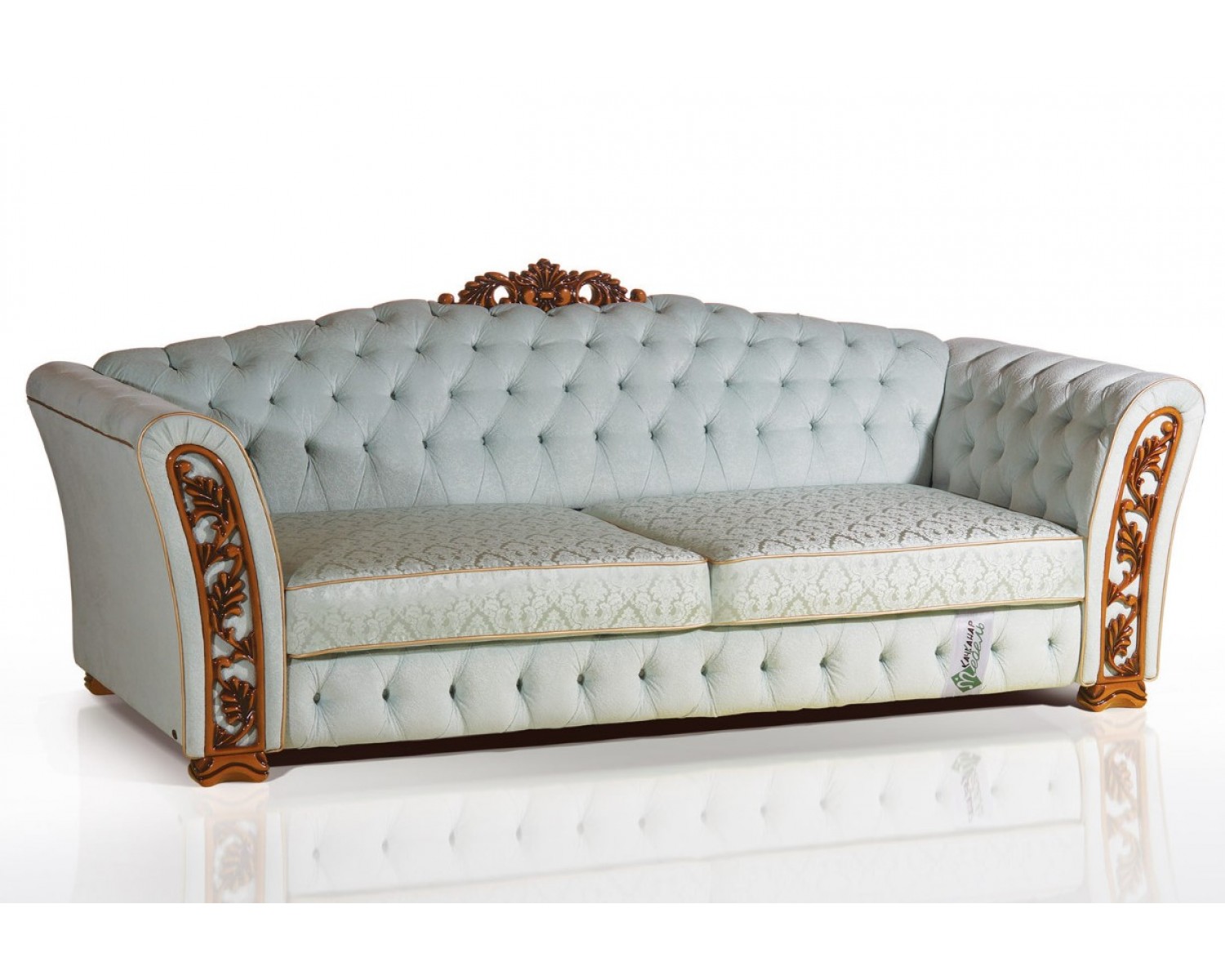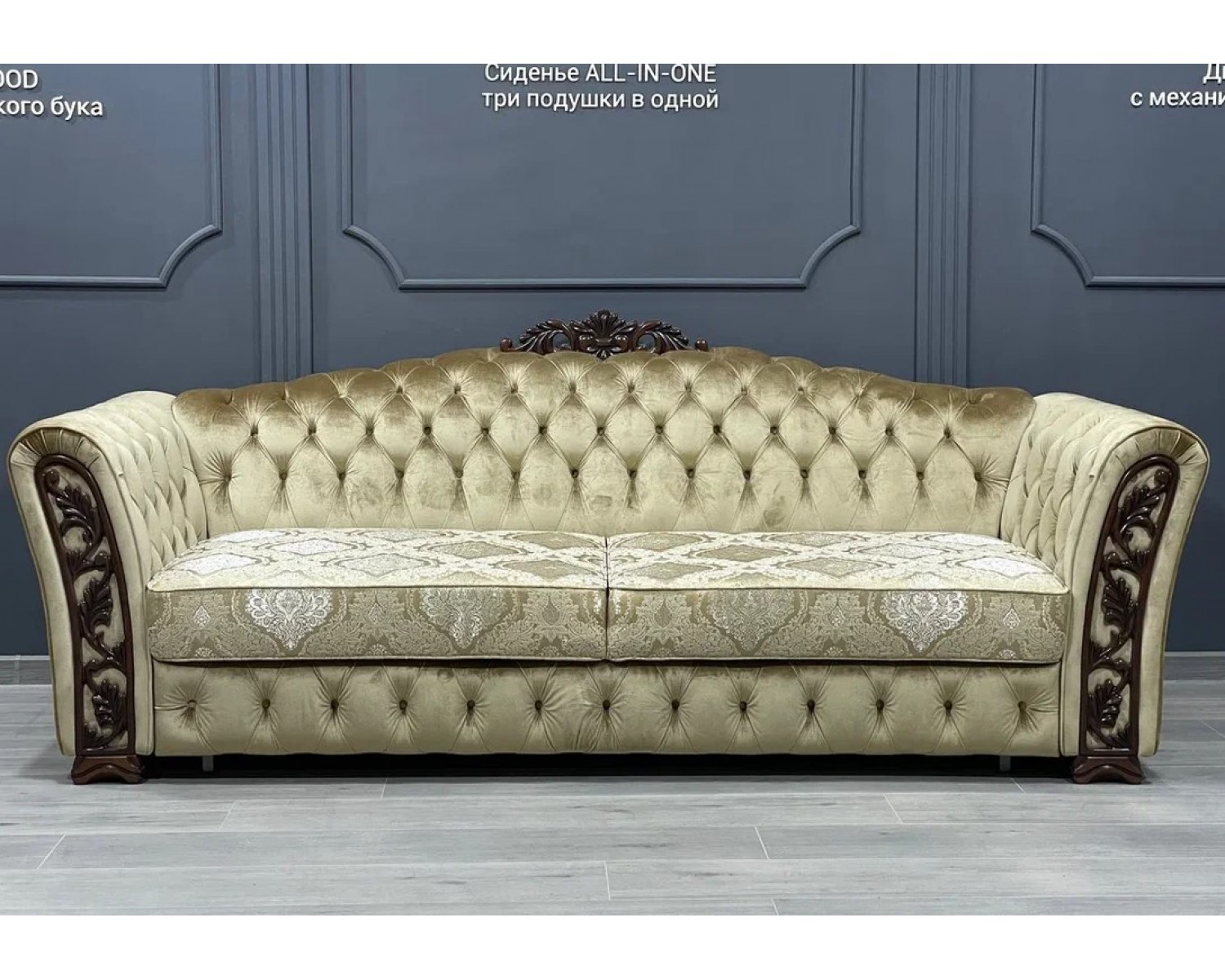 Ровное спальное место в разложенном виде размером 150*200 см. В основании сиденья используются пружины змейки и матрац из пенополиуретана марки HR 3535 толщиной 120 мм, что дает очень мягкую посадку. Для дополнительного усиления в основании подушек сиденья установлены металлические рамы. Резной декор выполнен вручную из натурального дерева (бук). В комплект (и цену) входят подушки. Диван поставляется полностью в разобранном виде.