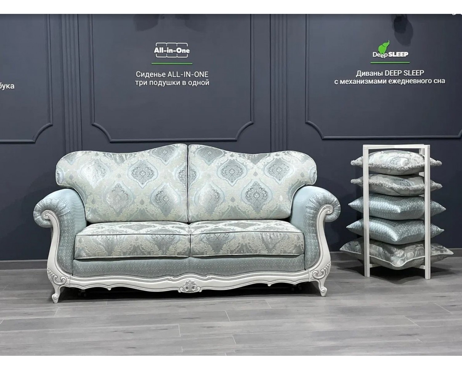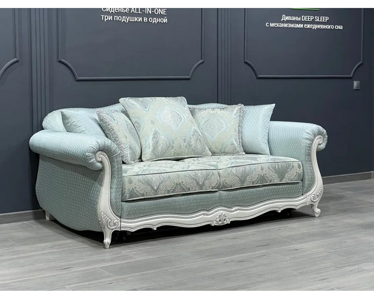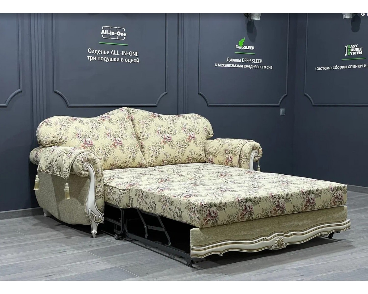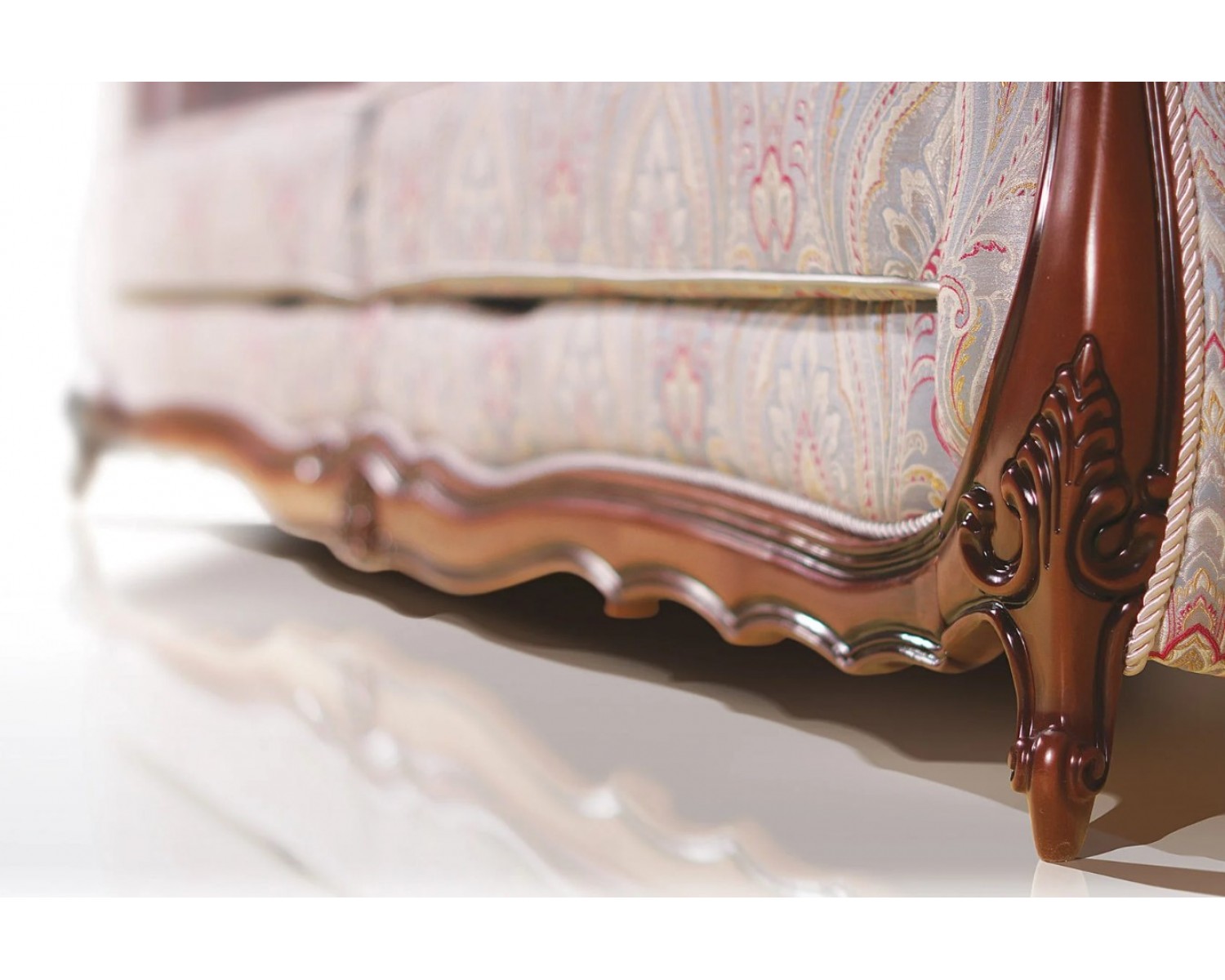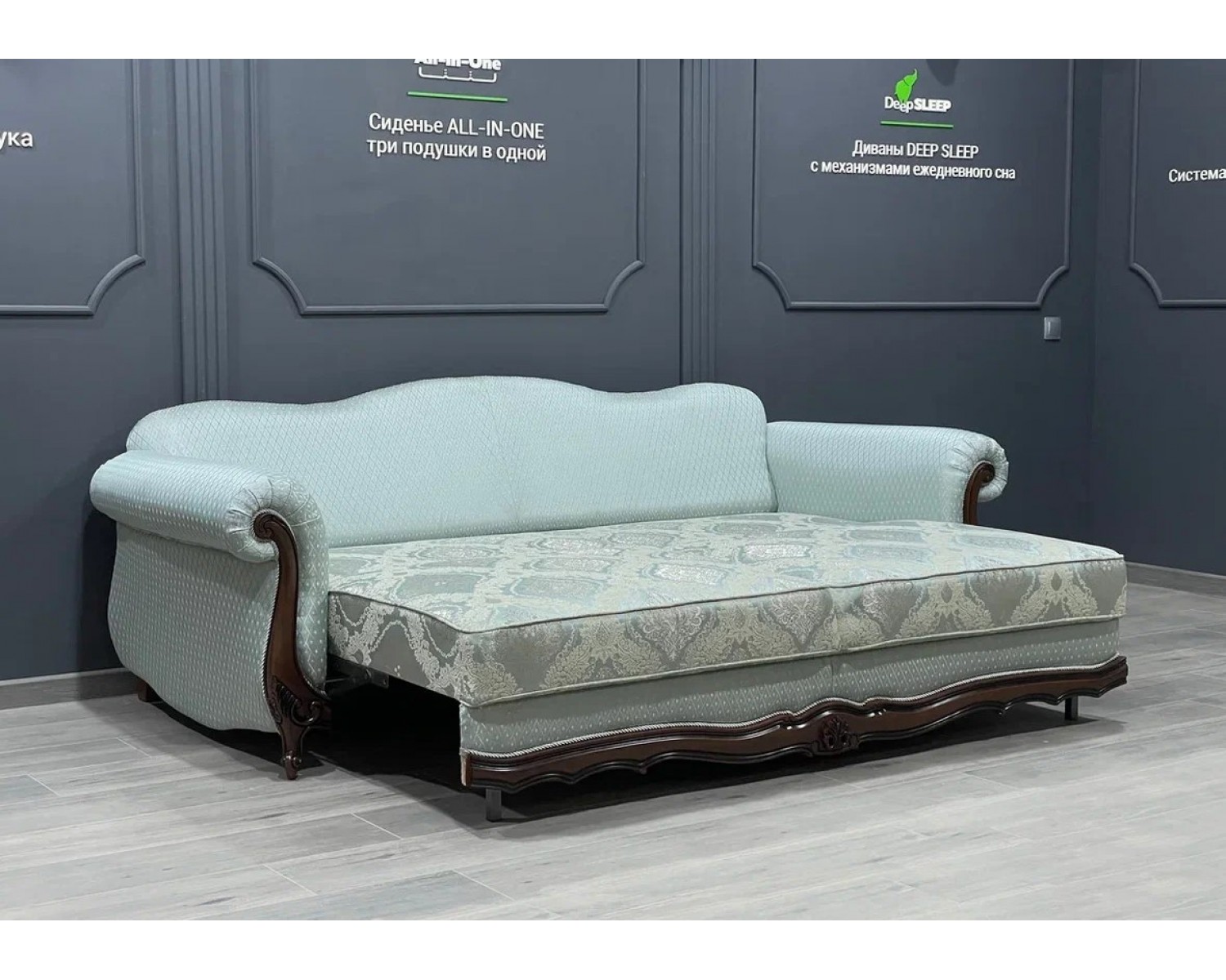 Диван трехместный раскладной "ЛОНДОН" из линейки мебели элит-класса классического стиля. Сочетает в себе две важные функции: комфортный диван и полноценное спальное место. Изящный декор из массива кавказского бука, бахромой на подушках и накидкой с кистями на подлокотниках.