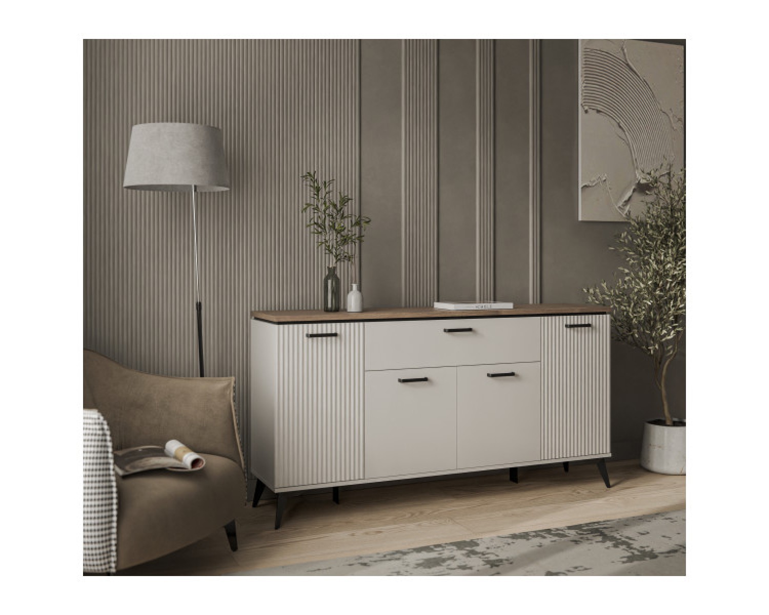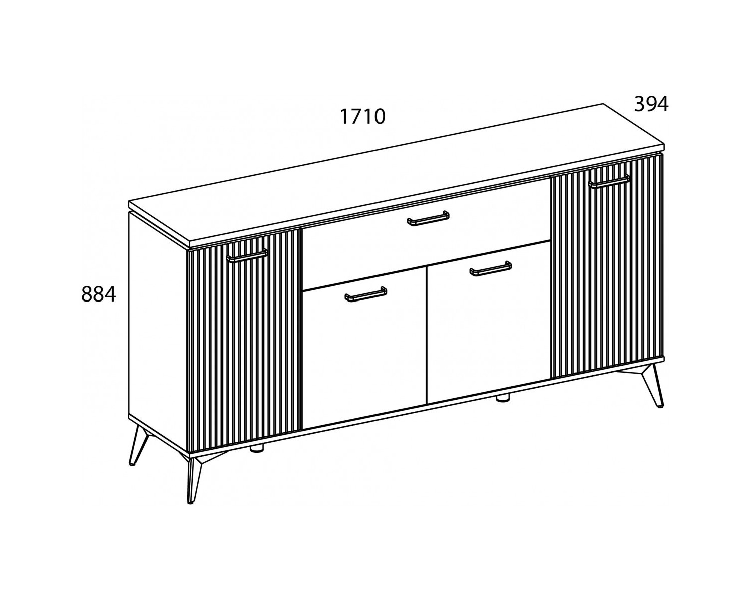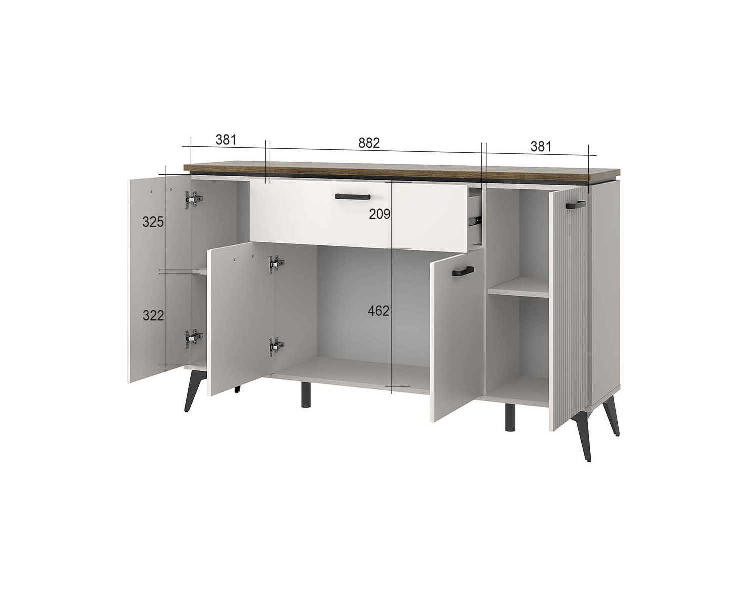 Тумба 4D1S также является универсальным элементом, так как её установка возможна в любом помещение, если позволяет площадь. Такой элемент мебели прекрасно себя проявит как самостоятельный предмет, при этом может быть оформлен различными стилистическими предметами декора. Также, возможно использовать его вместо тумбы RTV для организации ТВ-зоны в гостиной, установив телевизор на стене над тумбой. Конструкция тумбы 4D1S прямая, представляет собой одно отделение за двумя глухими дверями, два раздельных отделения с полками ЛДСП за высокими глухими дверями и один выдвижной ящик (1S). Двери (4D) распашные, крепятся на петли к внутренним перегородкам и боковому корпусу изделия.