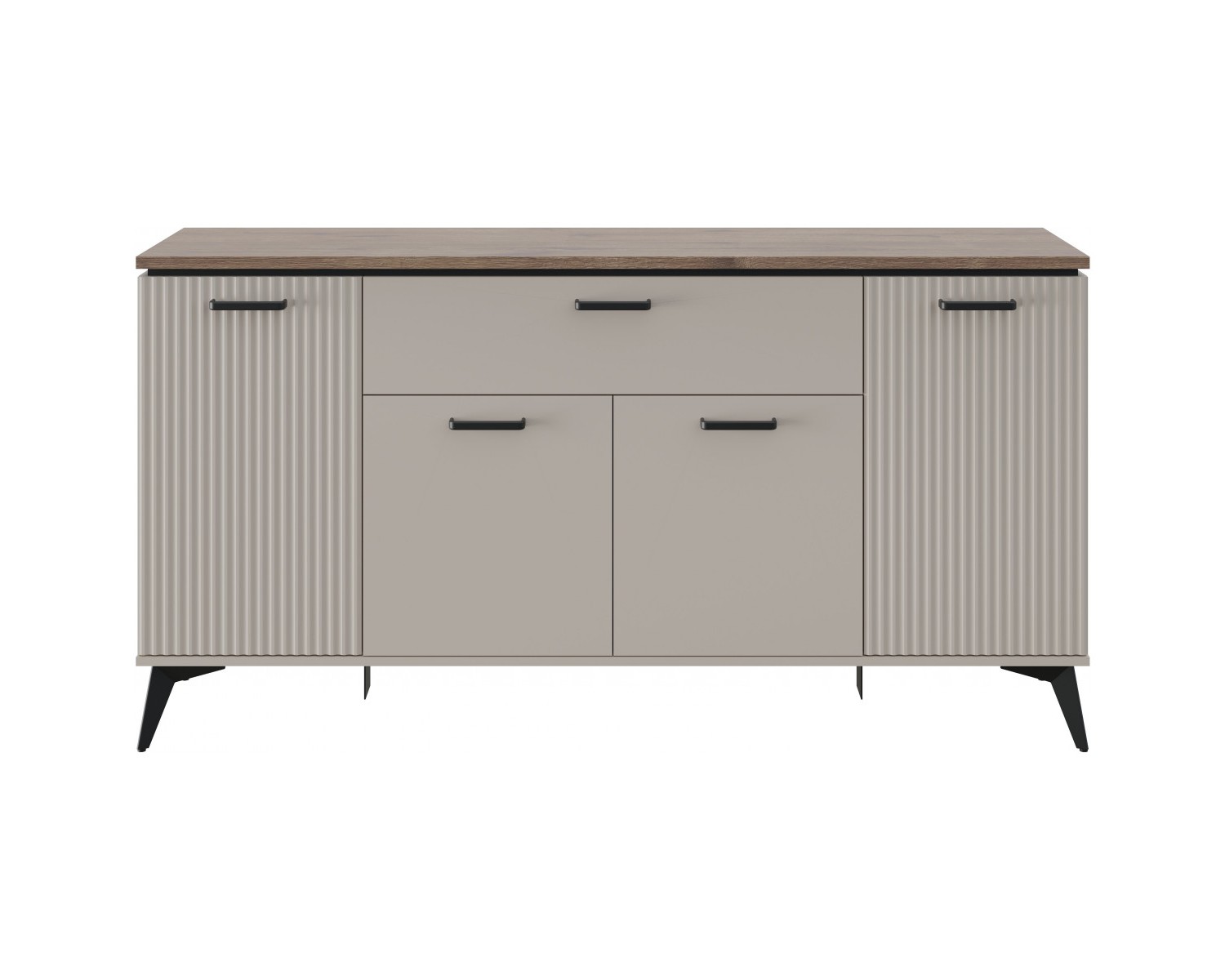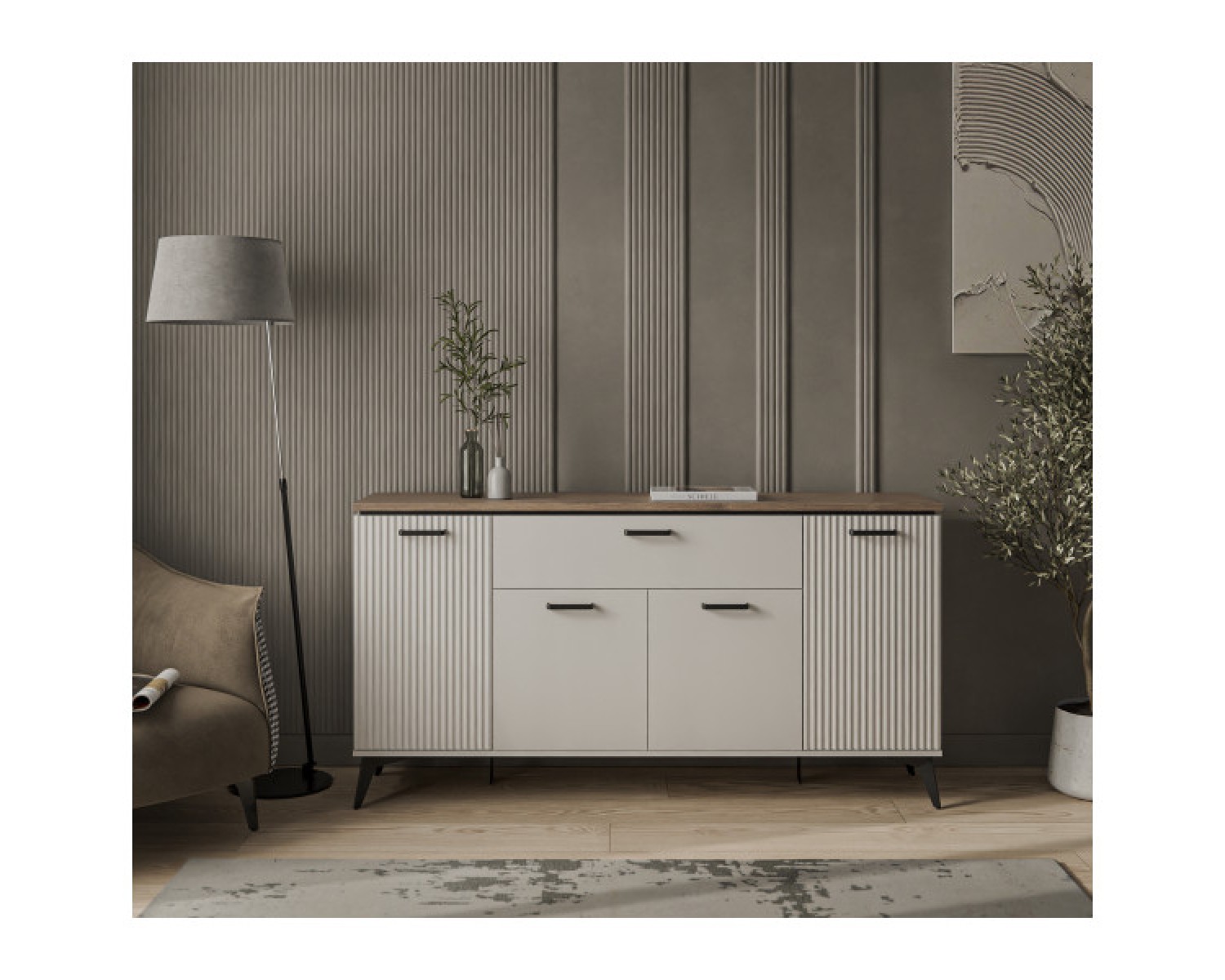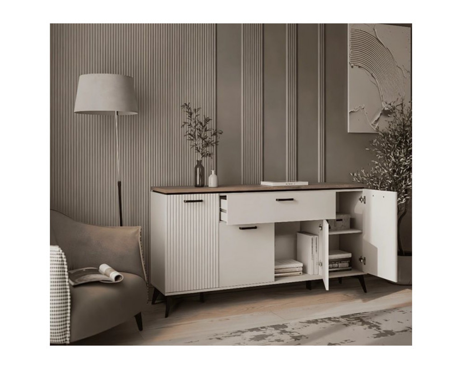 Тумба 4D1S также является универсальным элементом, так как её установка возможна в любом помещение, если позволяет площадь. Такой элемент мебели прекрасно себя проявит как самостоятельный предмет, при этом может быть оформлен различными стилистическими предметами декора. Также, возможно использовать его вместо тумбы RTV для организации ТВ-зоны в гостиной, установив телевизор на стене над тумбой. Конструкция тумбы 4D1S прямая, представляет собой одно отделение за двумя глухими дверями, два раздельных отделения с полками ЛДСП за высокими глухими дверями и один выдвижной ящик (1S). Двери (4D) распашные, крепятся на петли к внутренним перегородкам и боковому корпусу изделия.
