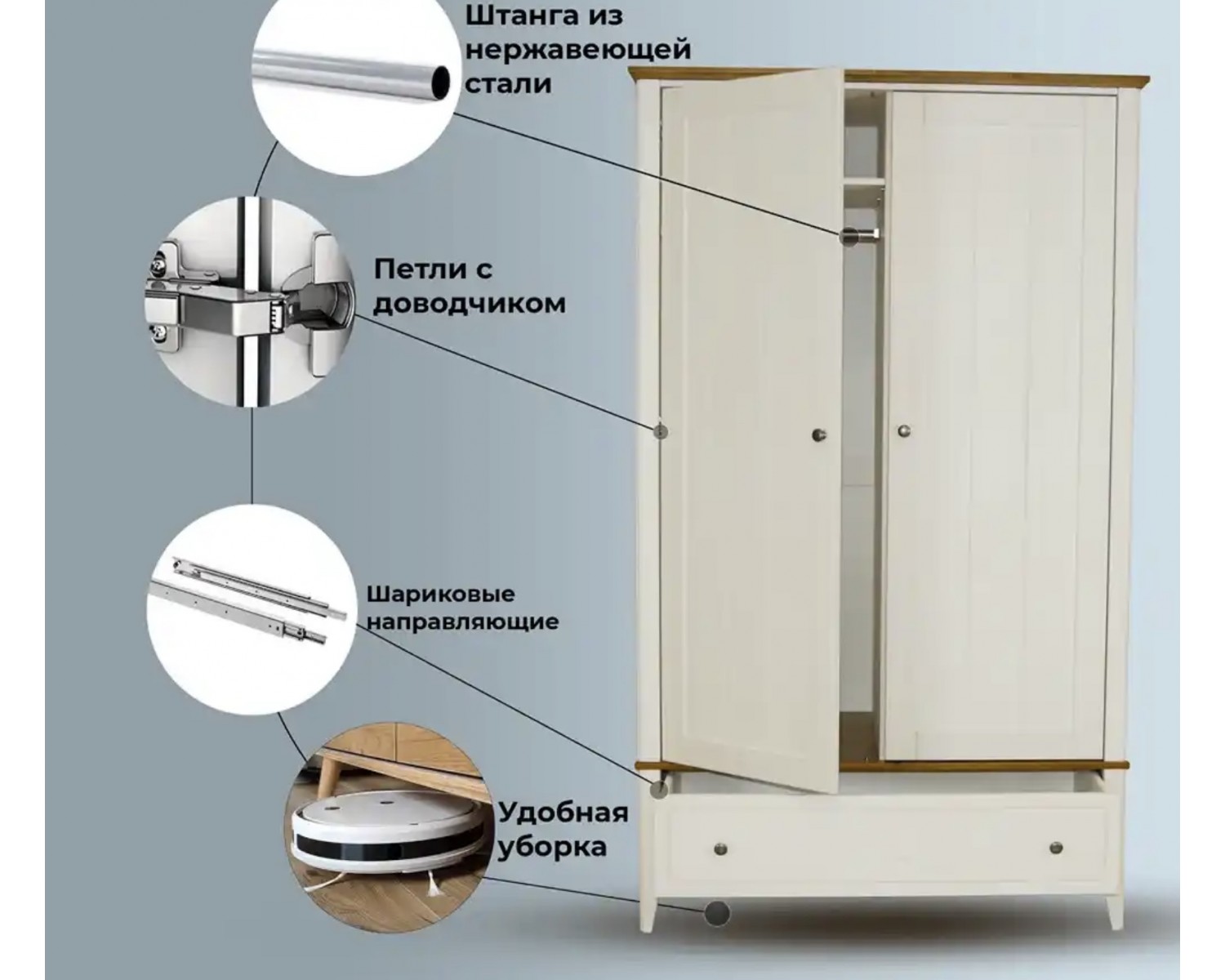 Удобной конструкцией: шкаф двухсекционный, справа три полки с регулировкой по высоте. Слева отделение со штангой для одежды и полкой сверху. Дверные петли с доводчиками Hettich для плавного закрывания. Внизу один широкий ящик на шариковых направляющих частичного выдвижения, без доводчиков. Высота от пола до нижней декоративной планки 12 см, под шкафом пройдет робот-пылесос.