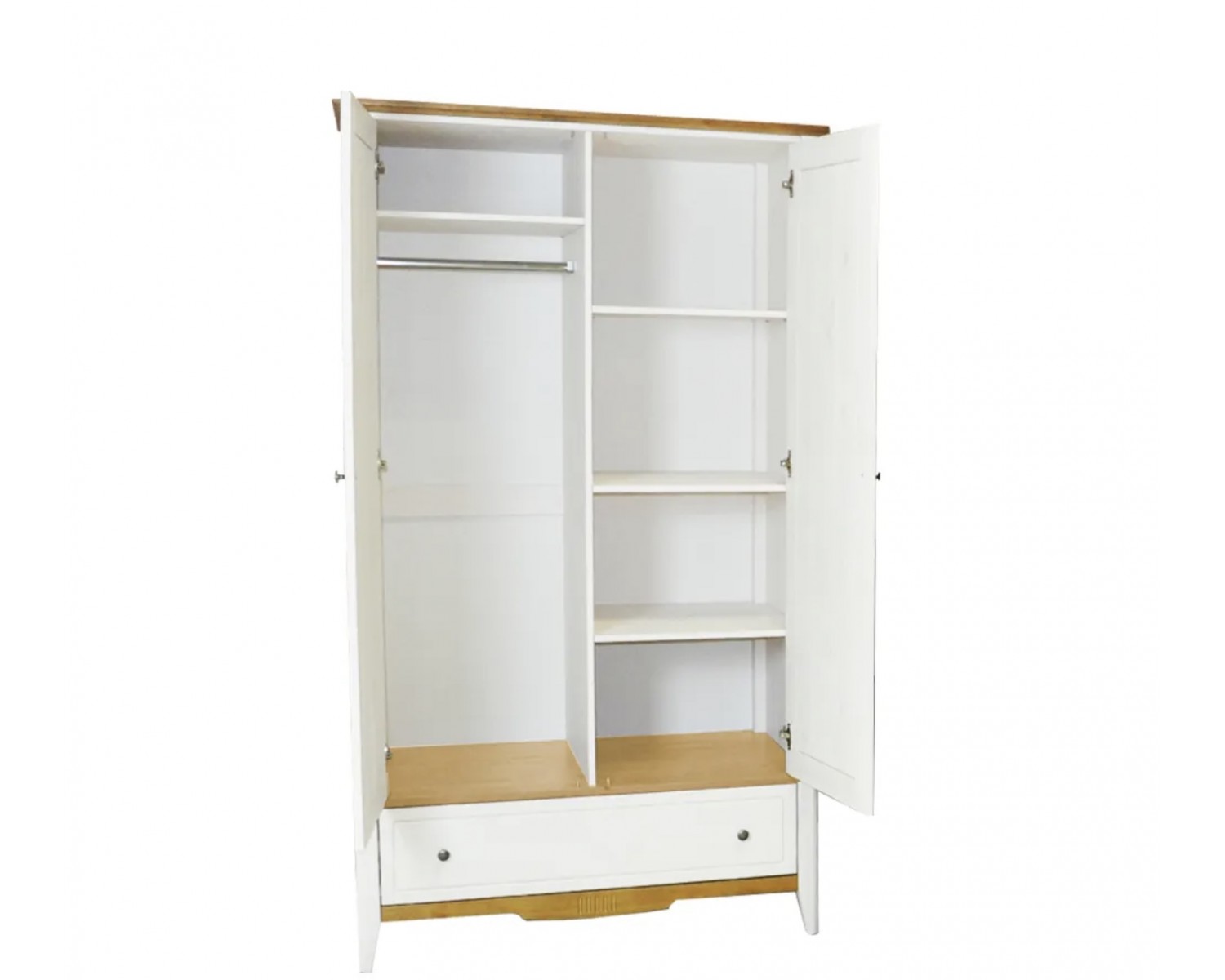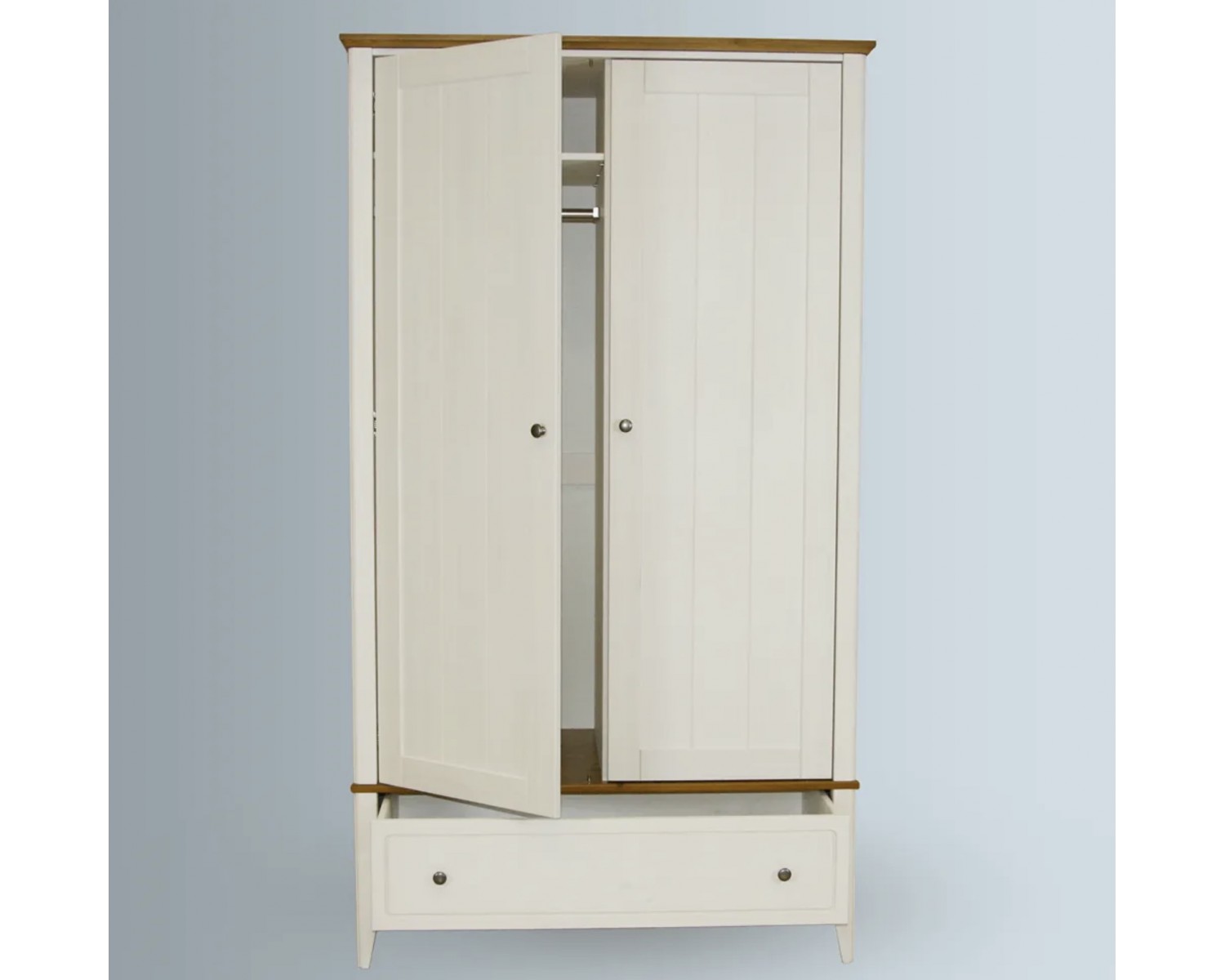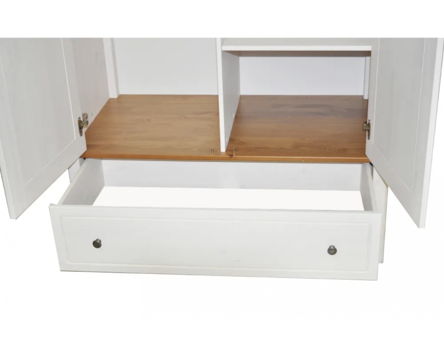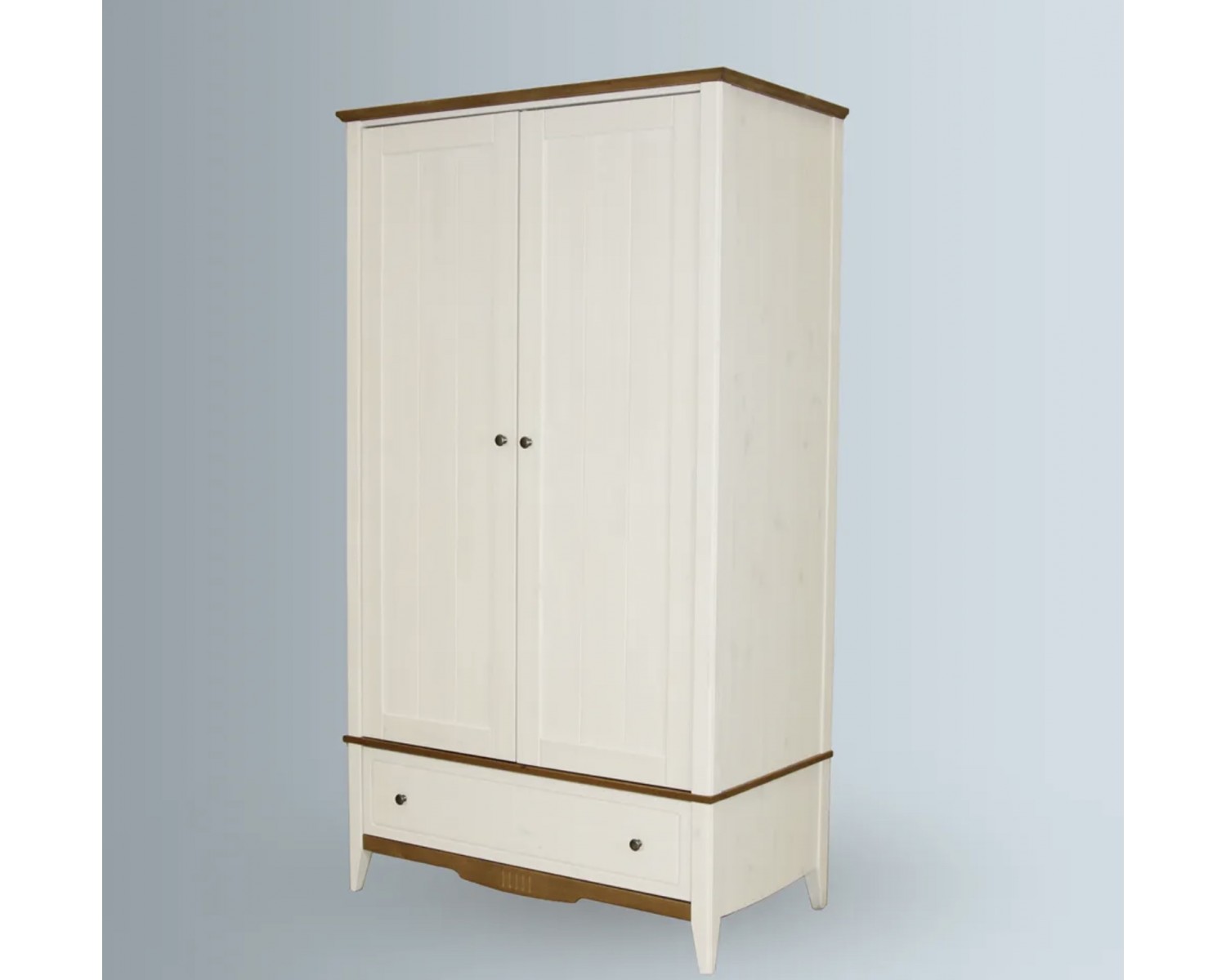 Оригинальным дизайном: корпус шкафа в белом цвете, а карниз, перекрытие между основным отделением и ящиком и нижняя декоративная планка в цвете антик, через покрытие антик видна текстура сосны. Можно заказать эту же модель шкафа в отделке «серый/антик». Фасады украшены фрезеровкой, в комплекте металлические ручки-кнопки с искусственным старением. Дно ящика изготовлено из ламинированного белого оргалита, стенки ящика сделаны из массива сосны, выкрашены в цвет корпуса.