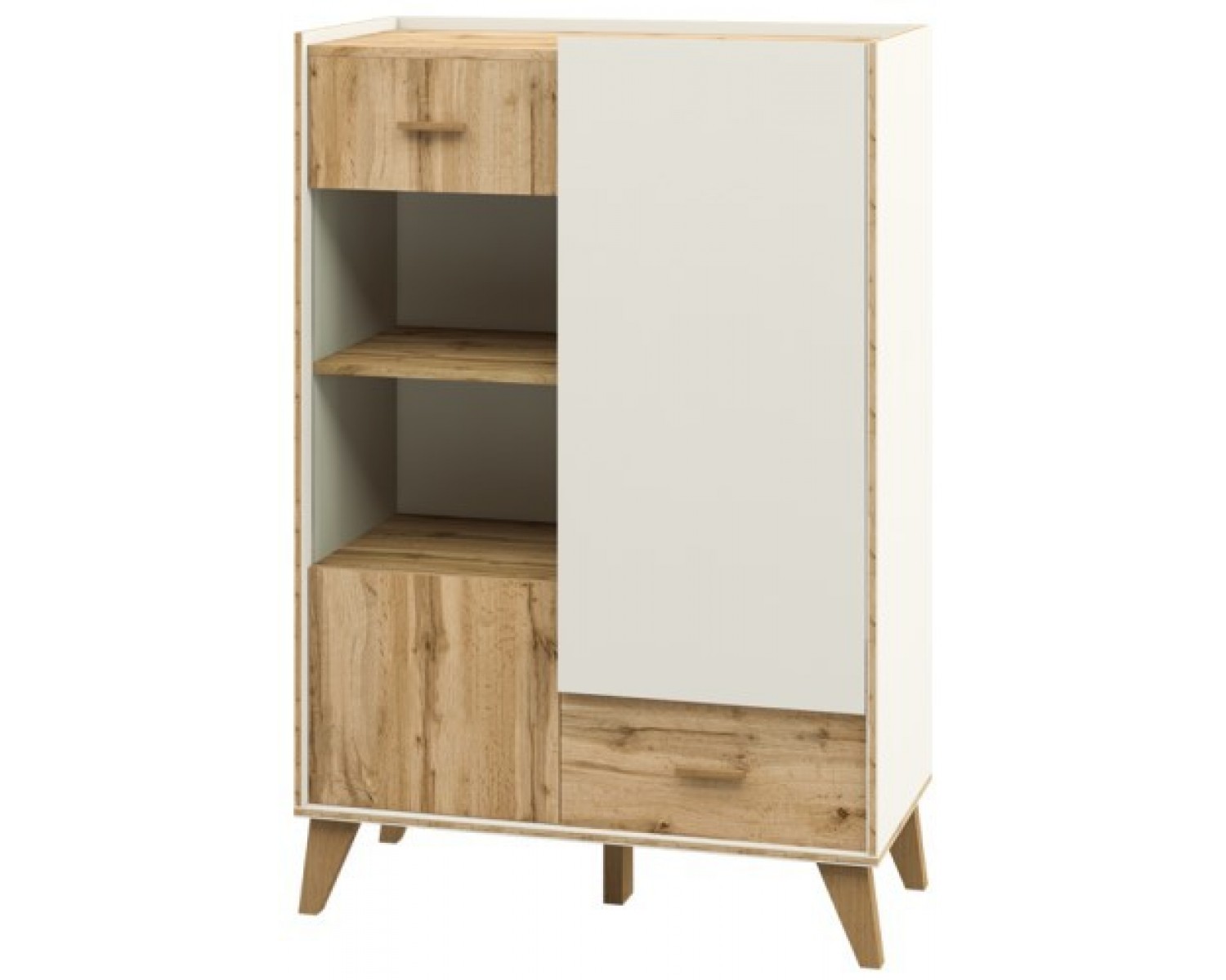 Внутреннее наполнение: 2 закрытых полки дверцей и 1 выдвижной ящик слева, справа - 2 открытые и 2 закрытые полки.