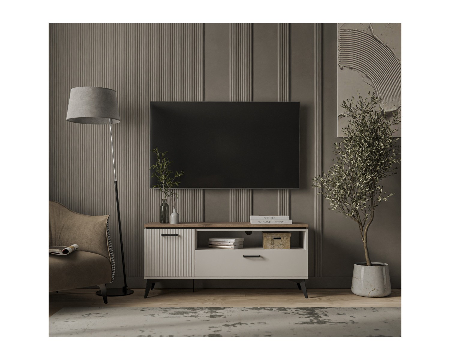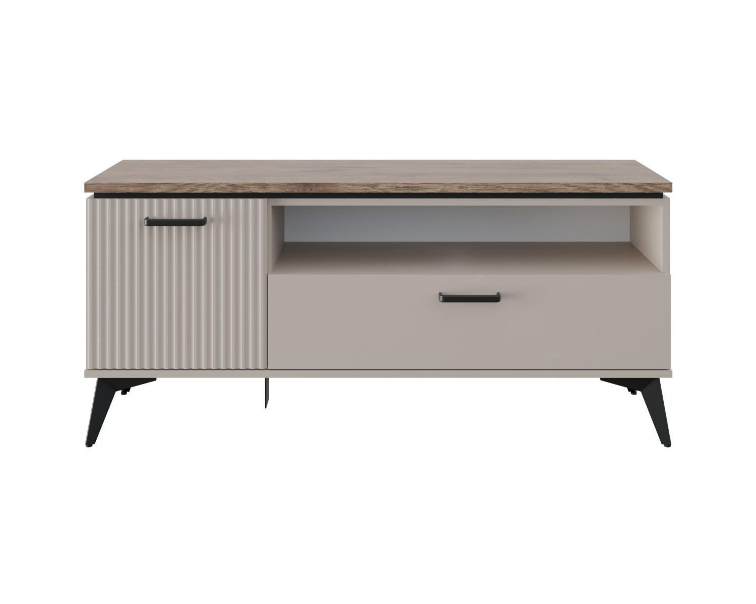 Тумба RTV 1D1SN VINATI. Если модель сравнивать с тумбой RTV 2D1SN VINATI, сокращена ширина – 1306 мм. Подойдёт для оформления гостиной с небольшой площадью. Может быть установлен как самостоятельный предмет мебели, так и в композиции с другими элементами коллекции VINATI. Конструкция тумбы RTV 1D1SN VINATI прямая, представляет собой одно отделение за глухой распашной дверью (1D), один выдвижной ящик (1S), одну открытую нишу (N). Дверь (1D) распашная, крепится на петли к боковому корпусу изделия.