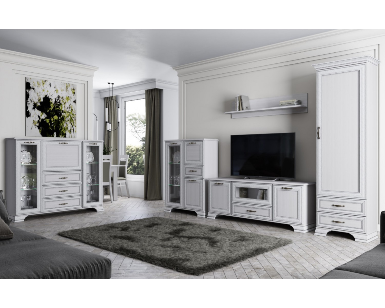 Тумба RTV 1V2D1S TIFFANY – расширенный функционал, разнообразие отделений, увеличенная высота и ширина. Данная модель может устанавливаться как самостоятельный элемент мебели либо в композиции с другими элементами коллекции, чтобы оформить роскошную гостиную. Конструкция тумбы RTV 1V2D1S прямая, представляет одно отделение за откидной витриной (1V), два отделения за глухими фасадами (2D) и один выдвижной ящик (1S).