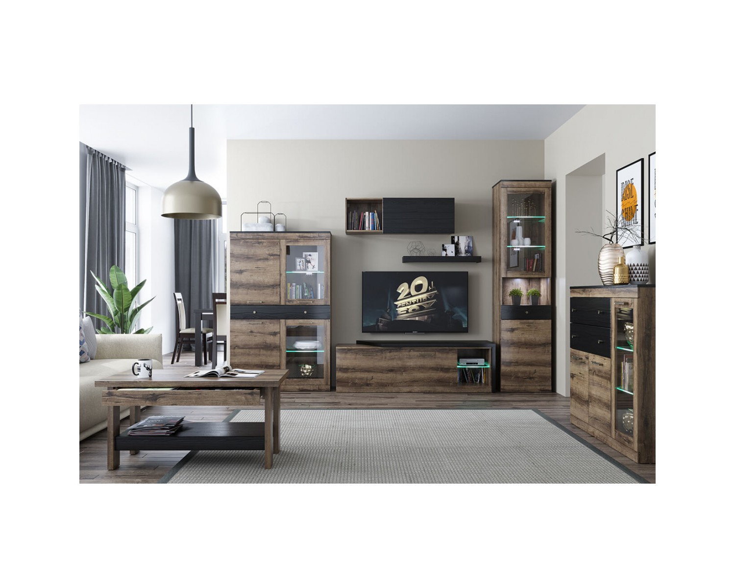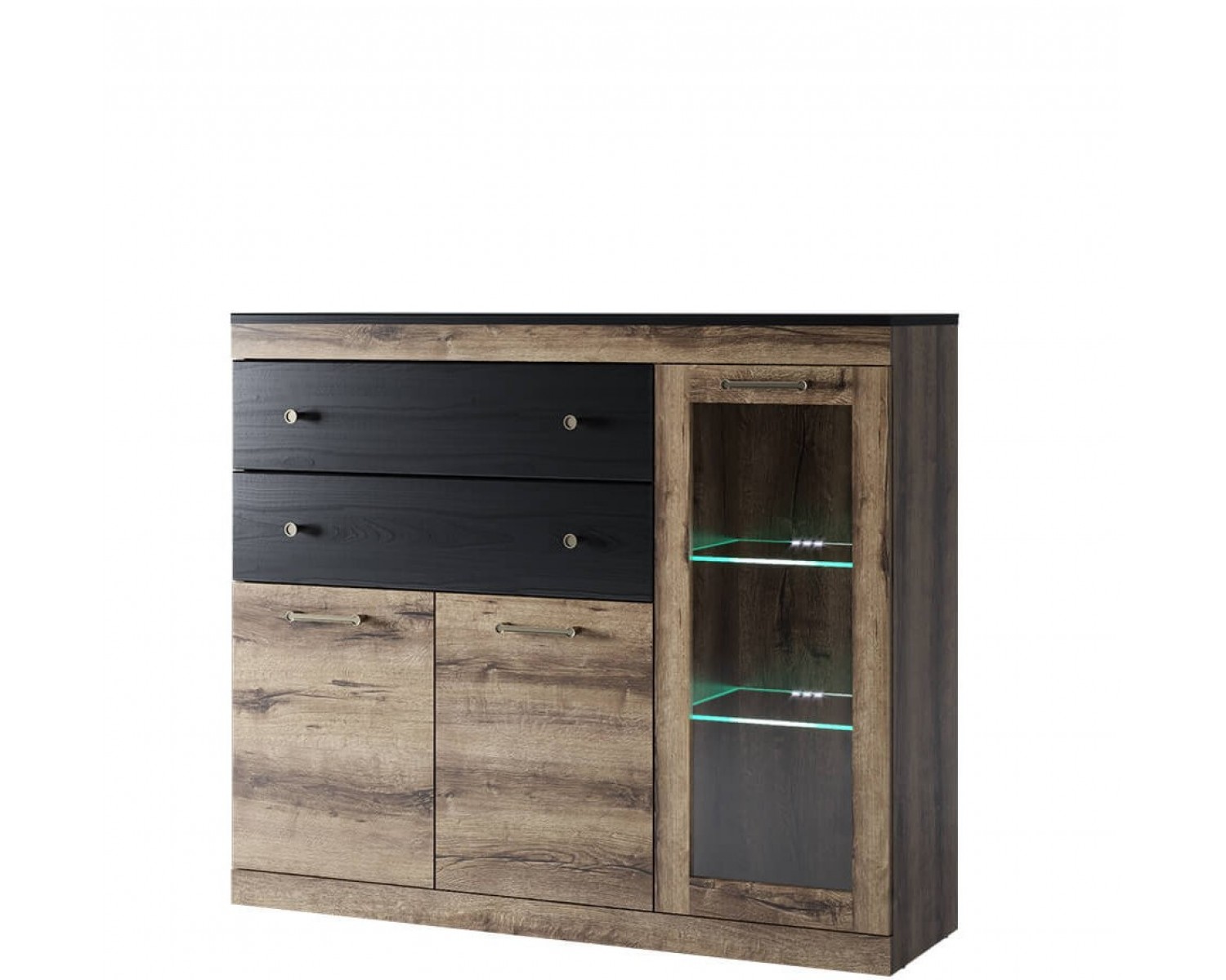 Материал: ЛДСП – 16 мм, цвет – дуб монастырский 375 SWN, ЛДСП – 18 мм (фасады выдвижных ящиков в цвете чёрный 660 WML), закалённое стекло – 4 мм (витрина в рамке ЛДСП).