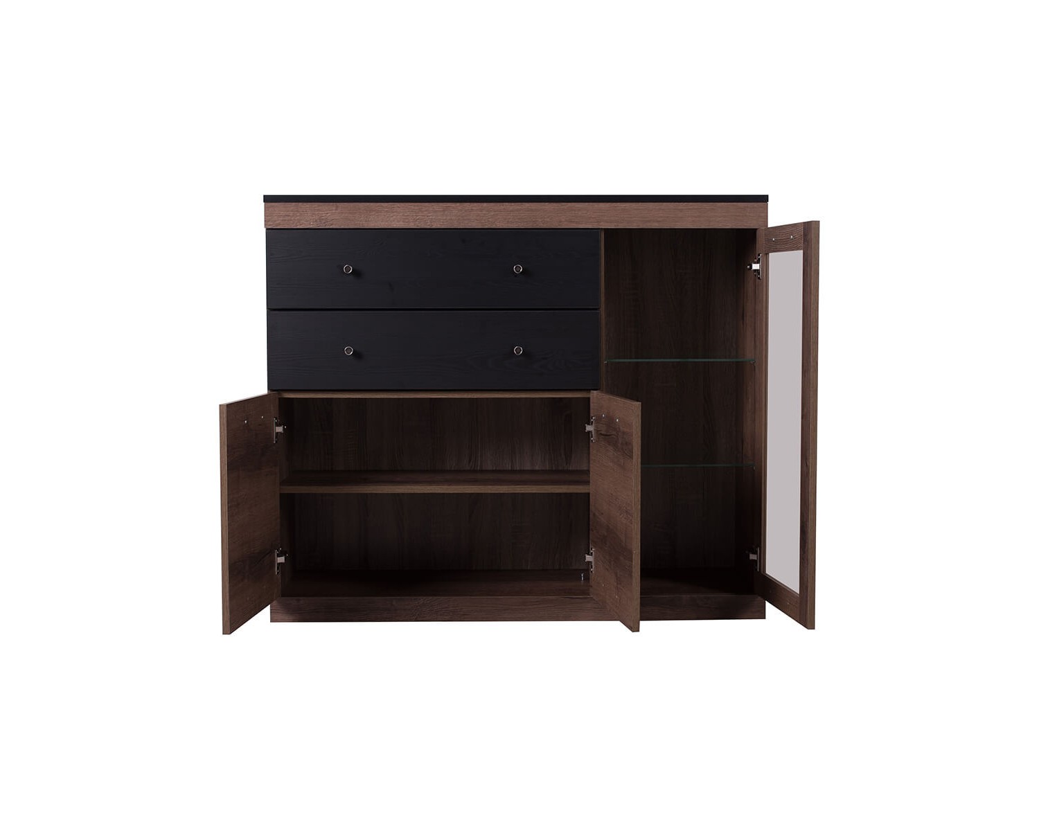 Полки: ЛДСП - 16 мм за глухим фасадом, цвет – дуб монастырский 375 SWN; закалённое стекло – 6 мм за витриной.