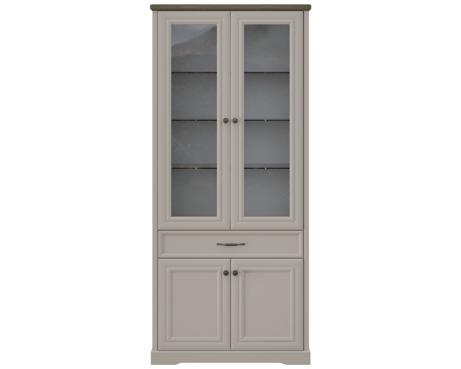 Шкаф с витриной 2V2D1S TOSCANA NEW – достойное разностороннее дополнение в интерьере гостиной, которое визуально расширит пространство, украсит его, организует хранение необходимых предметов и вещей. Внутреннее наполнение даёт возможность хранить красивые предметы декора, книги, памятные вещи, сувениры, которые всегда будут на виду. Конструкция шкафа с витриной 2V2D1S прямая, представляет собой отделение с полками из стекла за двумя витринами (2V), одно отделение с полкой ЛДСП за двумя глухими дверями (1S), один выдвижной ящик (1S). Витрины и двери распашные, крепятся на петли к боковому корпусу изделия. Особенностью элемента является использование петель и направляющих с доводчиками, сочетание контрастных текстур.