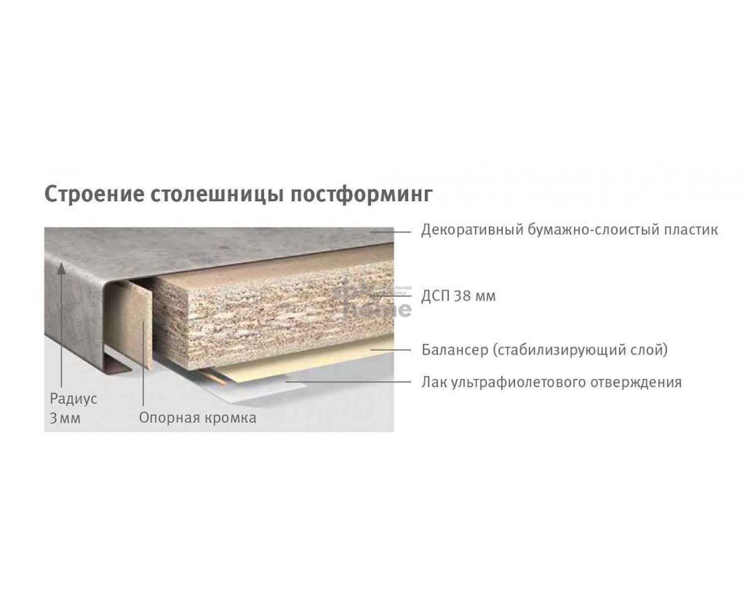 Столешницы, выполненные по технологии постформинг, привлекают бесшовной облицовкой, при которой бумажно-слоистый пластик непрерывно переходит с лицевой стороны по радиусу скругления кромки на нижнюю пласть столешницы. На передний продольный край столешницы под пластик нанесена опорная кромка из тонкой ДСП для придания изделию ударной прочности и абсолютной ровности поверхности. В качестве плиты-основы используется ДСП E1E05 TSCA.