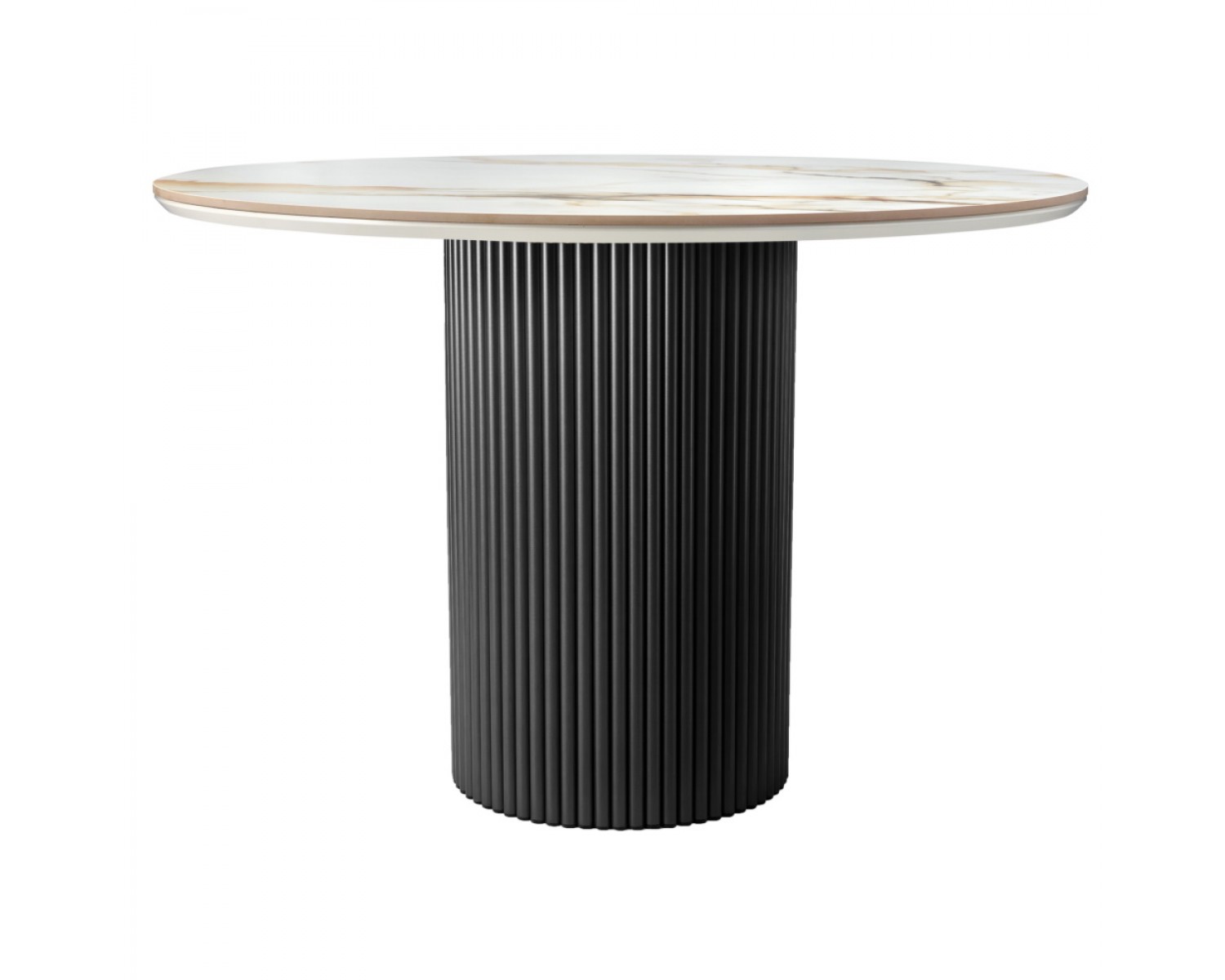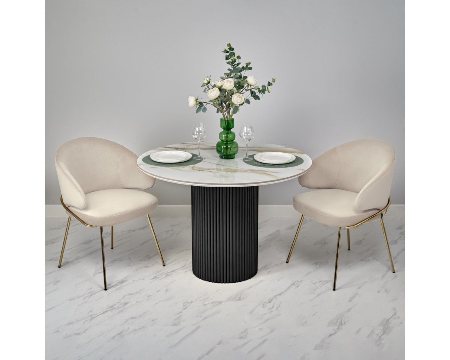 Стильный нераздвижной стол Aura – идеальное сочетание элегантности и функциональности. Стол Aura обладает глянцевой премиальной круглой столешницей из керамики, имитирующей белый мрамор, диаметром 110 см. Высококачественная керамическая столешница: поверхность стола не царапается, не впитывает жидкость и легко моется, что обеспечивает долгий срок службы и минимальный уход. Устойчивость к перепадам температур: идеально подходит для использования в любых условиях, не теряя своего великолепного вида. Роскошный дизайн: кристально-белый фон столешницы с элегантными серыми прожилками и изысканными золотистыми деталями добавляет нотку роскоши и утонченности интерьеру. Элегантная круглая опора: металлическая основа черного цвета придает столу стабильность и стильный современный вид, идеально гармонируя с мраморной столешницей. Стол Aura – это воплощение утонченного стиля и непревзойденного качества, которое украсит любой интерьер и станет любимым местом для встреч и общения. Подчеркните уникальность вашего дома с помощью стола Aura.