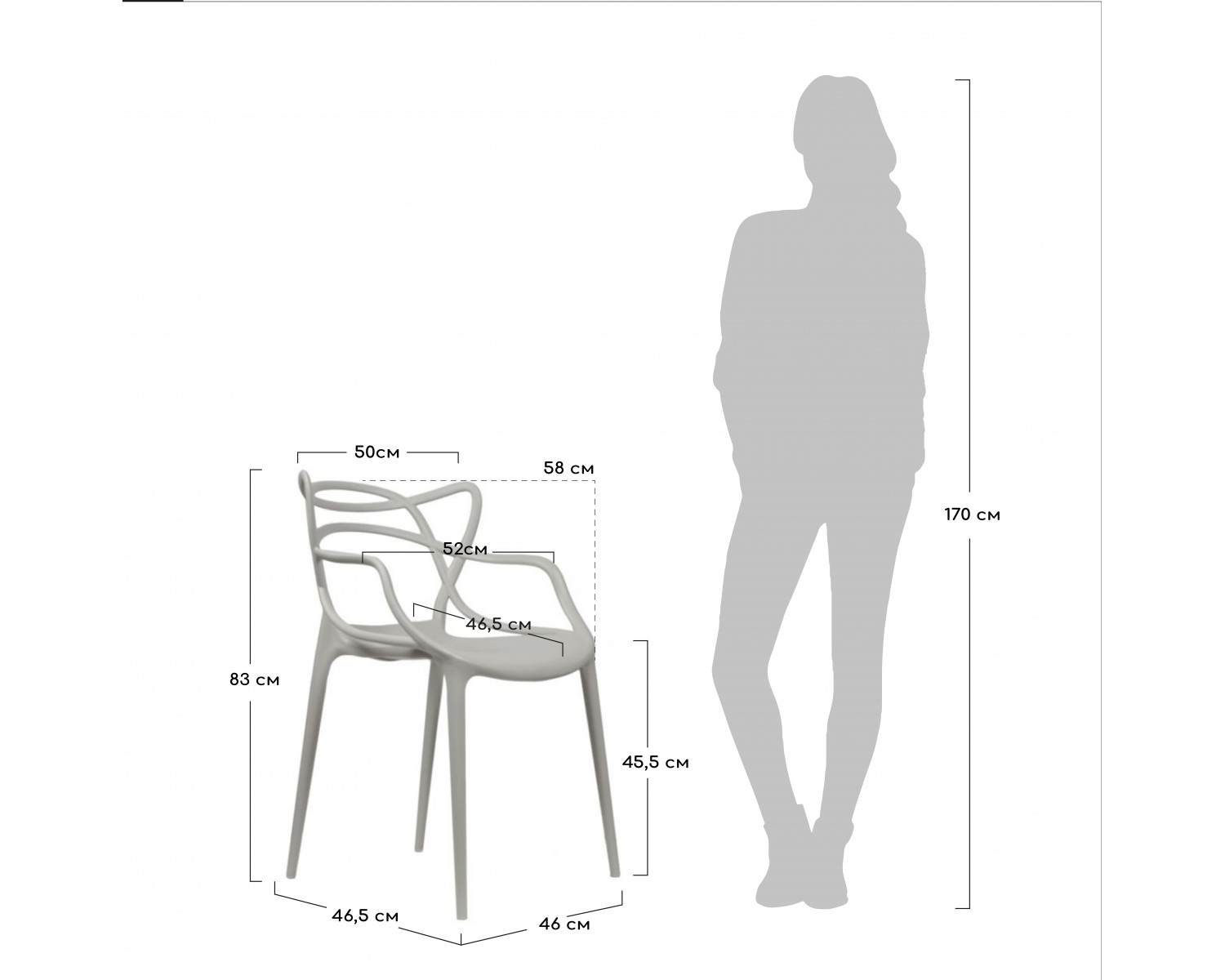 Материал: полипропилен. Размеры, см: Ш52хГ58хВ83 Высота сиденья: 45,5см Расстояние между ножками 46х46,5см Вес: 4 кг Максимальная нагрузка 150кг Штабелируется до 6шт Поставляется в собранном виде. Размер комплекта: 50х65х90см Вес комплекта: 8кг