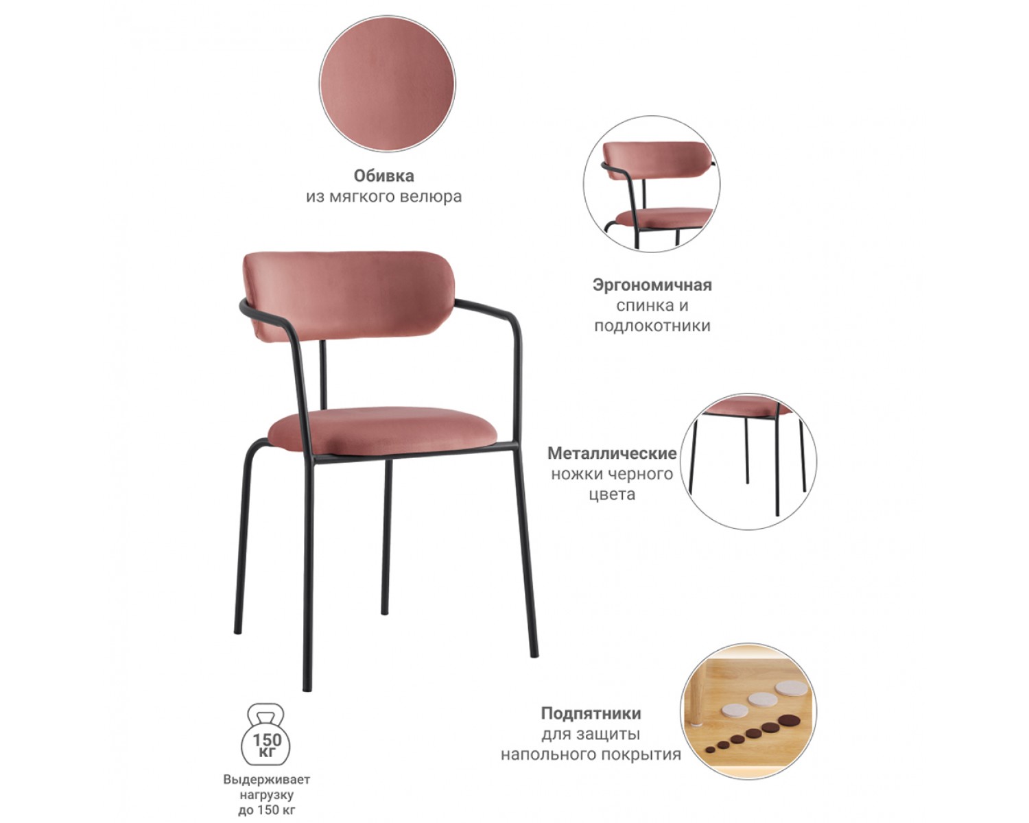 Материал: фанера, пенополиуретан, велюр Ножки из метала окрашены в черный матовый цвет. Металлическая труба размер: Ø19мм. Толщина: 1.2мм Плотность пенополиуретана: 20кг/м³ на спинке, 25 кг/м³ в сиденье Размер: 58х54х79см Высота сиденья: 47,5см Вес: 5,2кг Максимальная нагрузка: 150кг Поставляется в разобранном виде. В комплекте идёт инструкция и комплект аксессуаров для сборки.