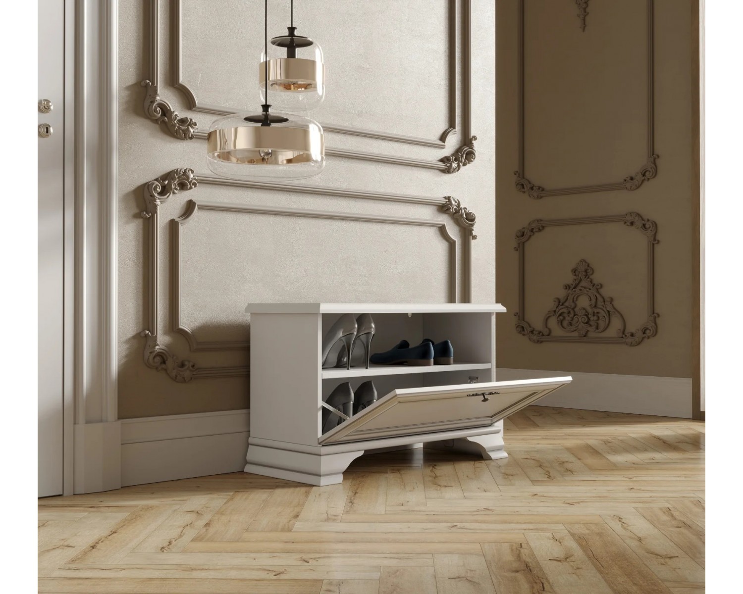 Обувница S320-SFK1B KENTAKI. Имеет отделение для хранения обуви. Ножки декорированы планкой из МДФ. Ручки металлические, в бронзовом цвете.