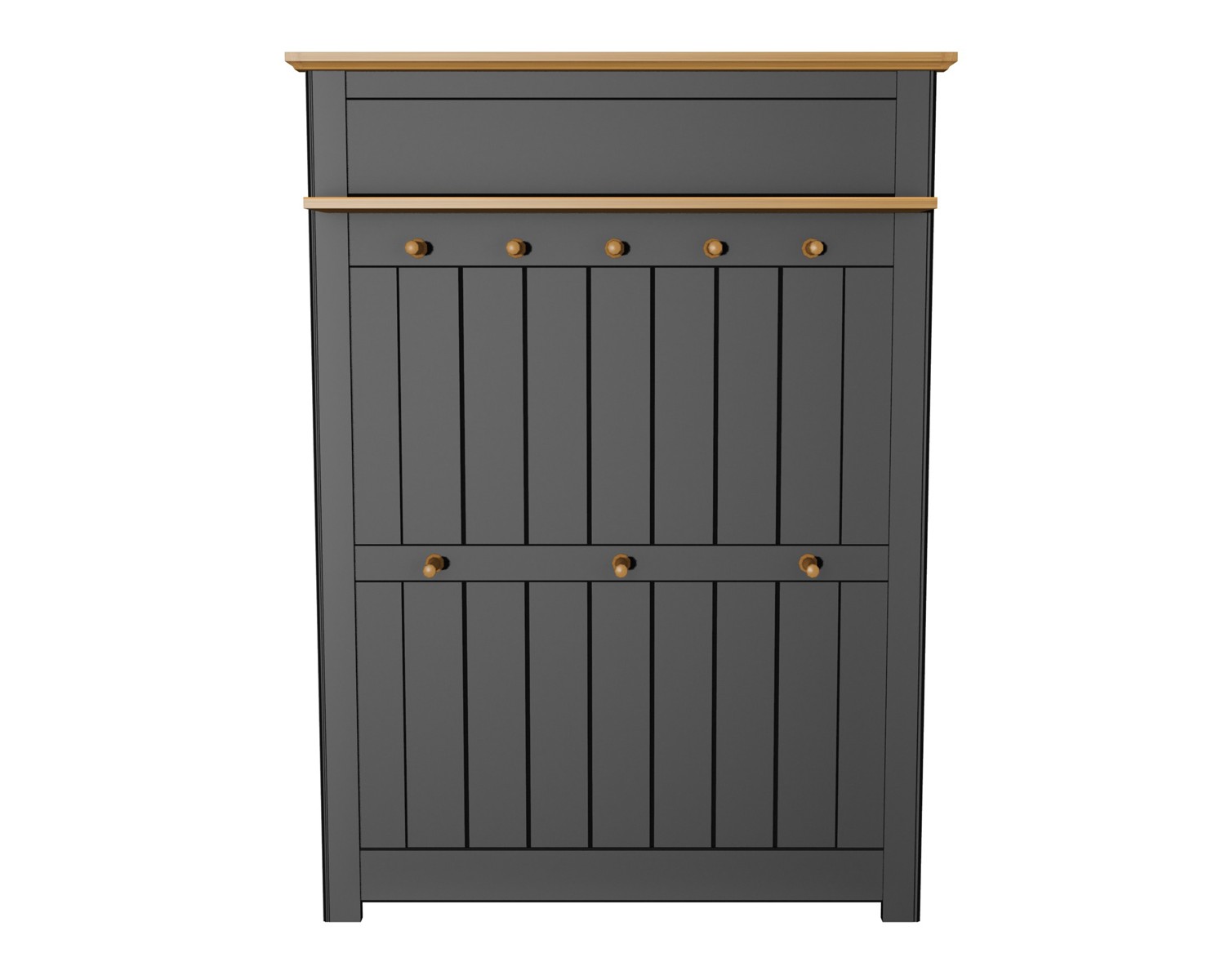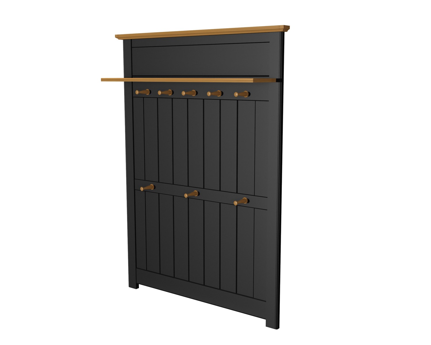 К панели крепятся 8 деревянных крючков для верхней одежды, сумок и зонтов, а также полка для головных уборов, варежек, перчаток. Панель вешалки выполнена в белом цвете, а карниз, крючки и шляпная полка в цвете антик. Другие варианты окрашивания: «серый/антик» и «черный/антик». Преимущество мебели «Пенни» – качественные гипоаллергенные лаки на водной основе от известного производителя Backer Acroma (Швеция). Панель вешалки декорирована вертикальной фрезеровкой.