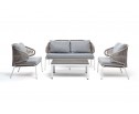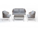 Лаунж-зона «Милан» предназначена для размещения четырех персон. Она включает в себя: - журнальный столик (размер - 900×600×400 мм). - два плетеных кресла (размер - 700×650×830 мм). - двухместный диван (размер - 1450×650×830 мм). Каркас уличной мебели выполнен из износостойкого алюминия. Его дополняет оплетка цвета серый меланж, изготовленная на основе эластичных синтетических лент из полиэфирных волокон высокой прочности. Кресла и диван идут в комплекте с мягкими подушками в чехлах светло-серого цвета.