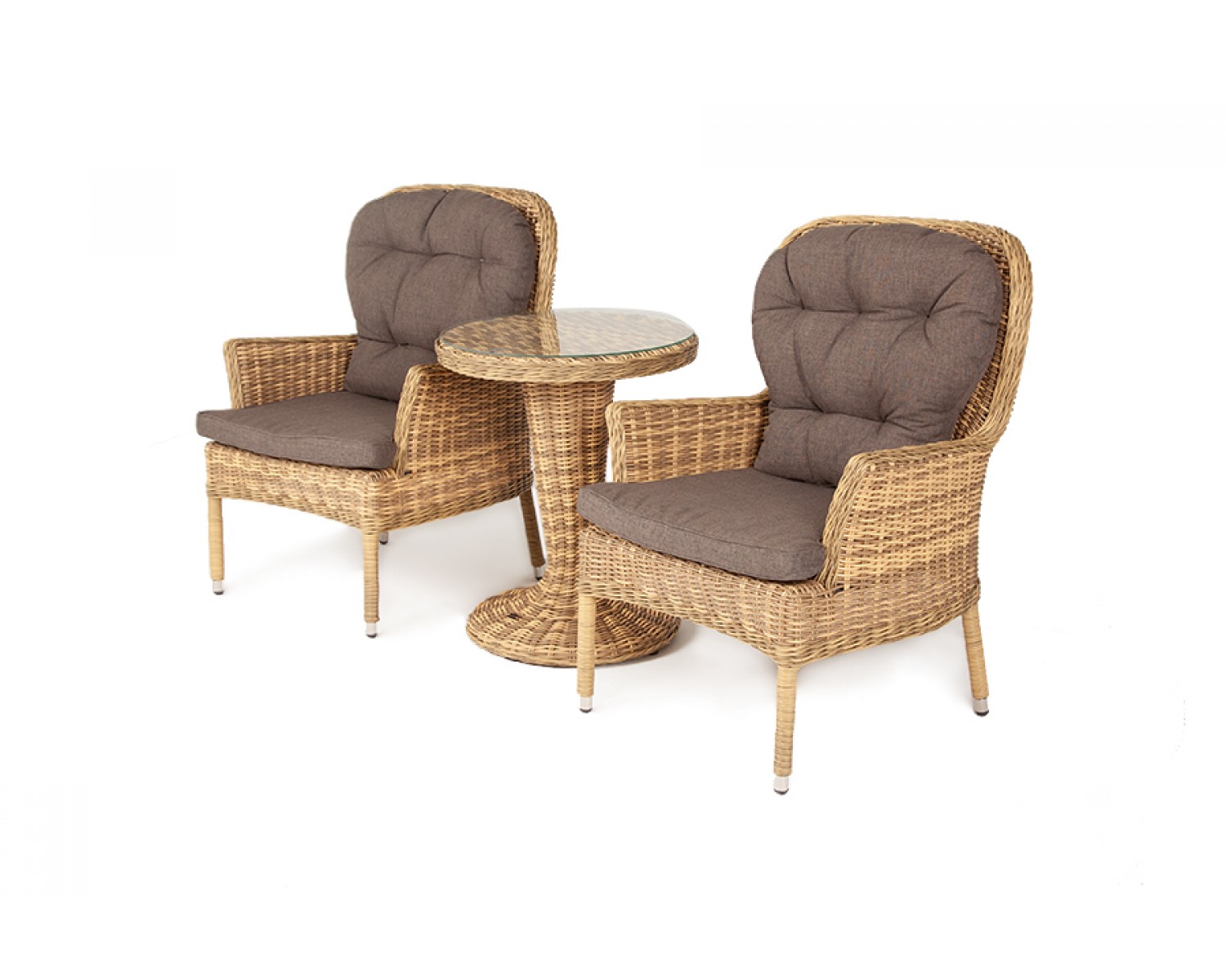 Кофейный комплект «Алиса» рассчитан на 2 персоны и подходит для расположения на балконе, в небольших гостиных, на террасе и других местах с ограниченным пространством. В основе каркас из алюминия. В состав входят: – круглый стол 600×600×750 мм (толщина стеклянной столешницы в 0,5 см). – 2 кресла - 710×820×1105 мм. Плетение выполнено вручную искусственным ротангом соломенного цвета, кресло укомплектовано подушками из 100% полиэстера, которые пропитаны специальным составом, обладающим влагоотталкивающим свойством.