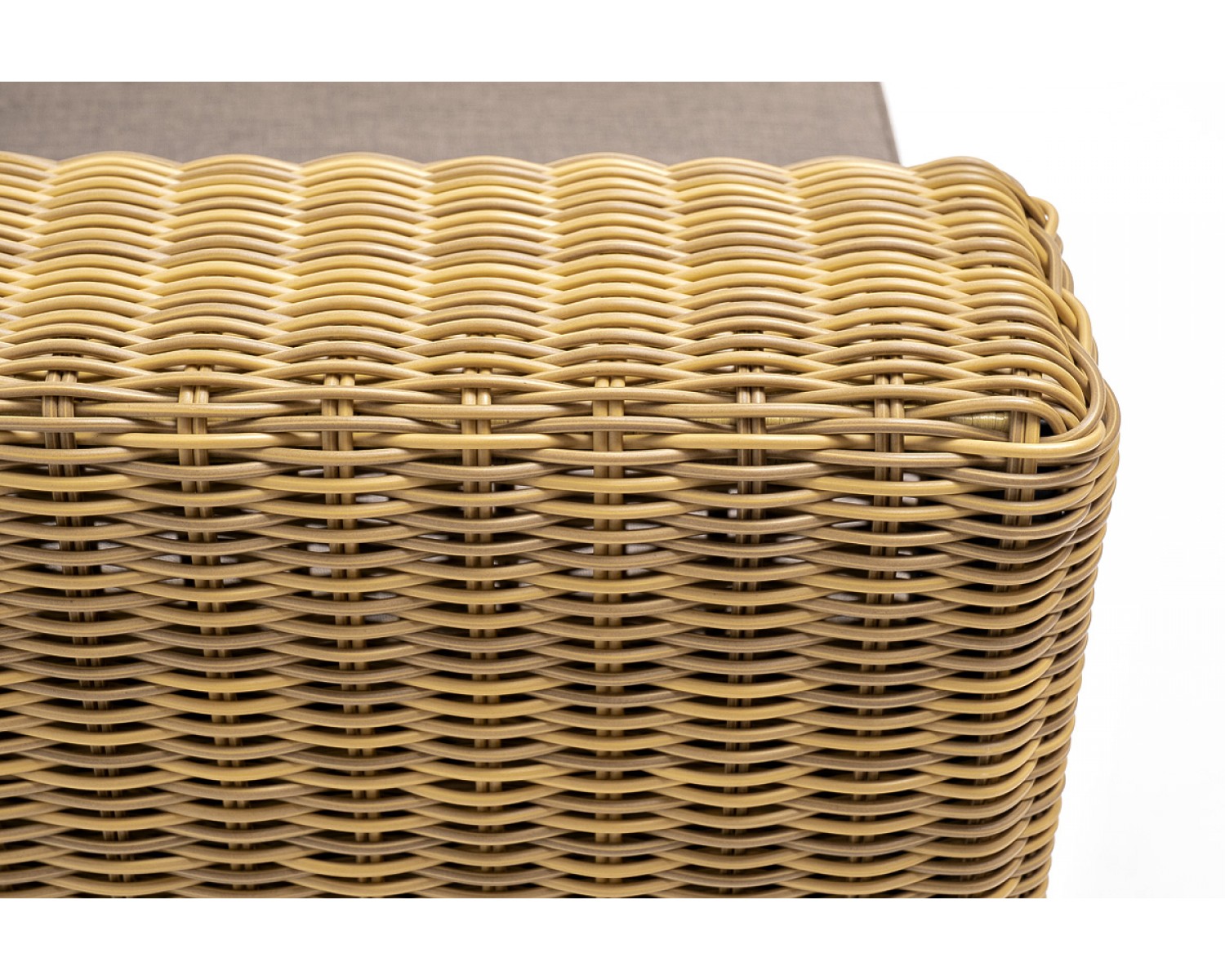Комплект «Боно» с плетением из искусственного круглого ротанга для обустройства лаунж-зоны. В ее составе находятся: - трехместный диван – 2300×900×775 мм. - два кресла – 1000×900×775 мм. - журнальный столик – 1300×600×400 мм. В качестве основы применяется прочный алюминиевый каркас. Цвет комплекта – соломенный. На креслах и диване предусмотрены мягкие подушки, съемные чехлы которых пошиты из полиэстера, плотностью 230гр/м2. Ткань в обязательном порядке пропитывается влагоотталкивающими составами. Поверхность плетеного столика представляет столешница из закаленного стекла – 5 мм.