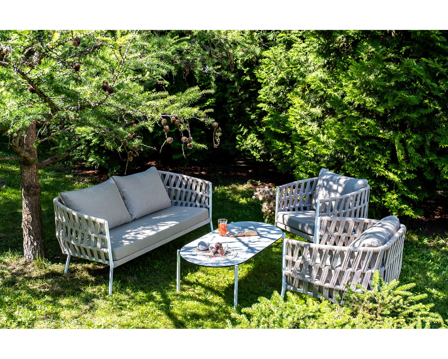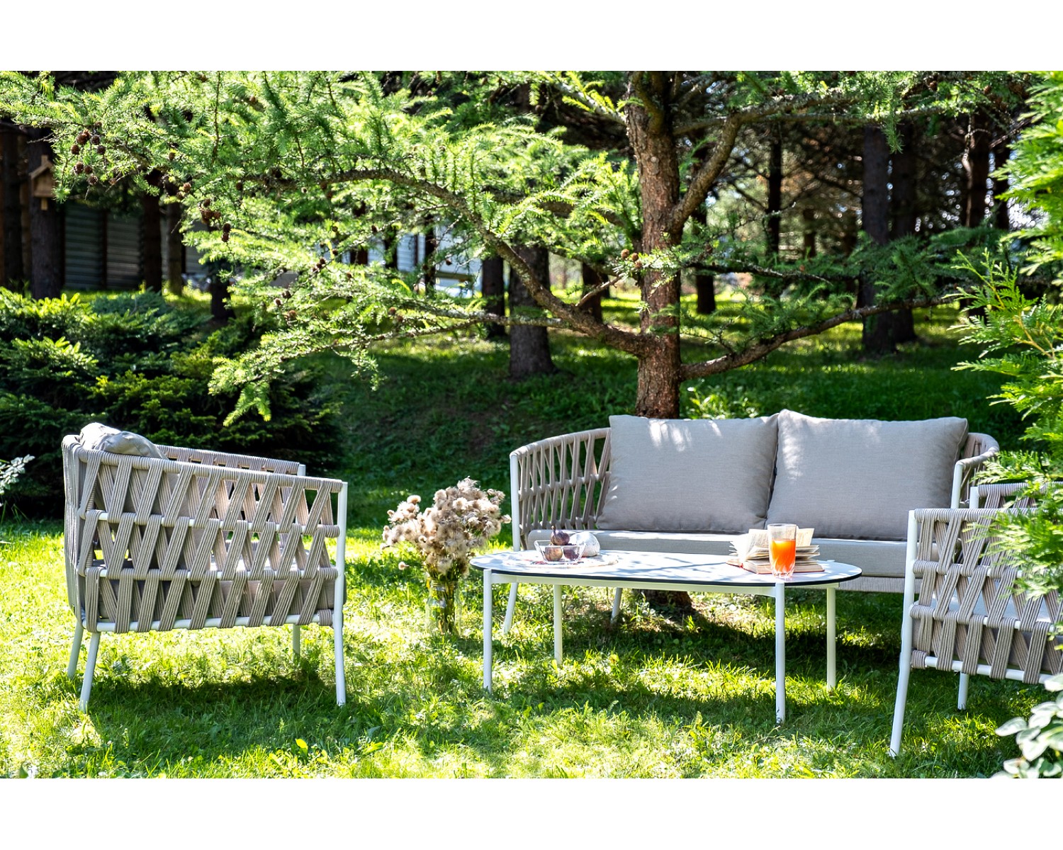Лаунж-зона «Диего» предназначена для размещения четырех персон. Она включает в себя: - журнальный столик (размер - 1200×600×400 мм). - два плетеных кресла (размер - 770×720×770 мм). - двухместный диван (размер - 1580×720×770 мм). Каркас уличной мебели выполнен из износостойкого алюминия. Его дополняет бежевая ручная оплетка, изготовленная на основе эластичных синтетических лент из полиэфирных волокон высокой прочности (роупа). Кресла и диван идут в комплекте с мягкими подушками в чехлах бежевого цвета.