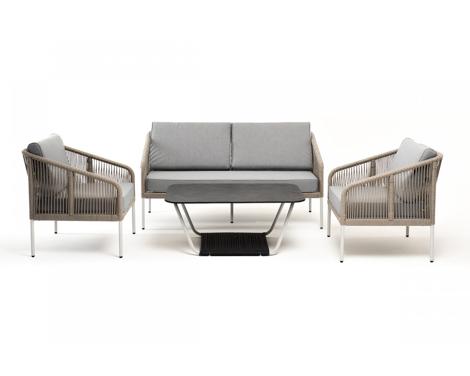 Лаунж-зона «Канны» предназначена для размещения четырех персон. Она включает в себя: - журнальный столик (размер – 900×600×420 мм). - два плетеных кресла (размер – 700×700×750 мм). - двухместный диван (размер – 1500×700×750 мм). Каркас уличной мебели выполнен из алюминия. Его дополняет оплетка - салатовый меланж, изготовленная на основе эластичных синтетических лент из полиэфирных волокон высокой прочности. Кресла и диван идут в комплекте с мягкими подушками в чехлах светло-серого цвета.