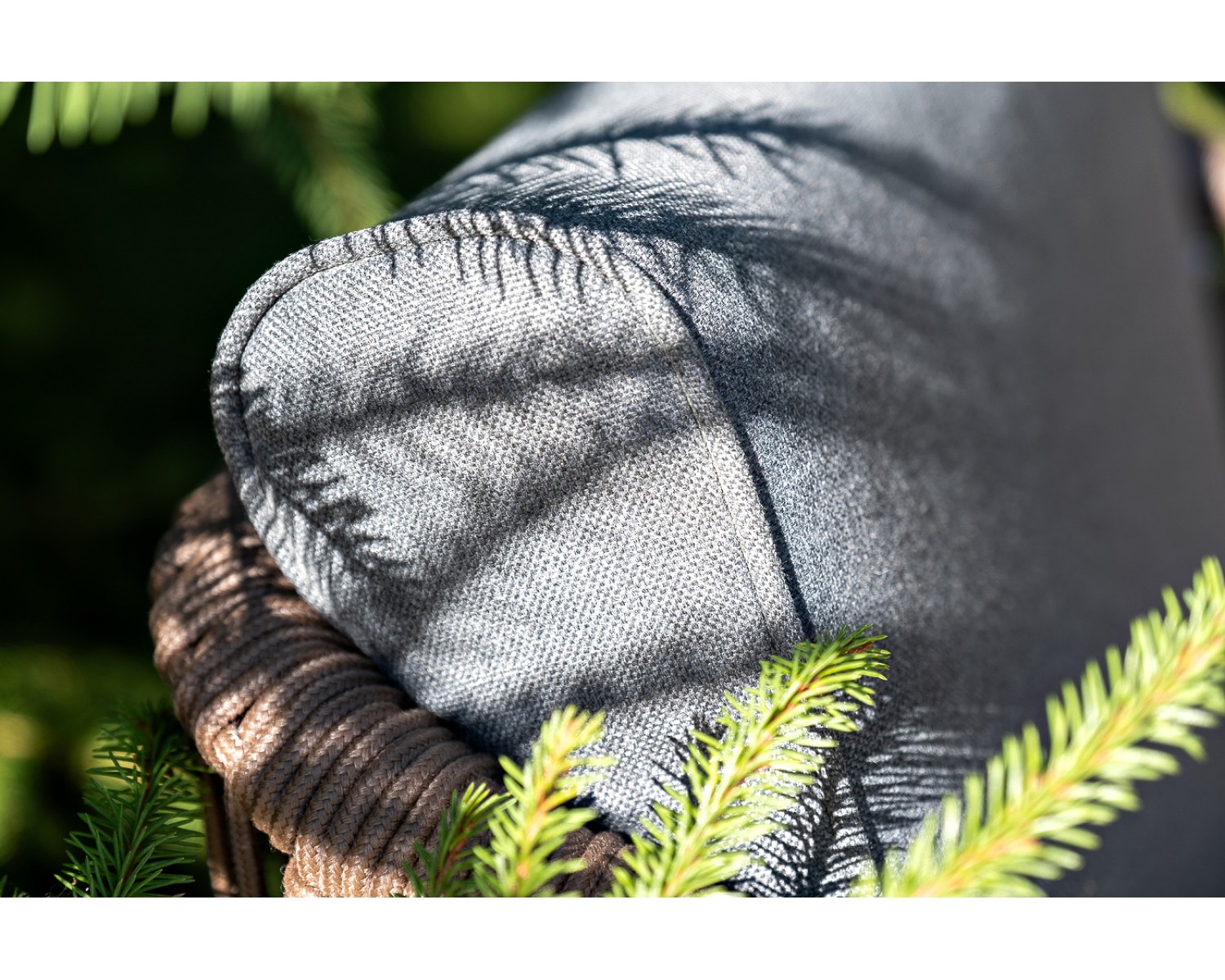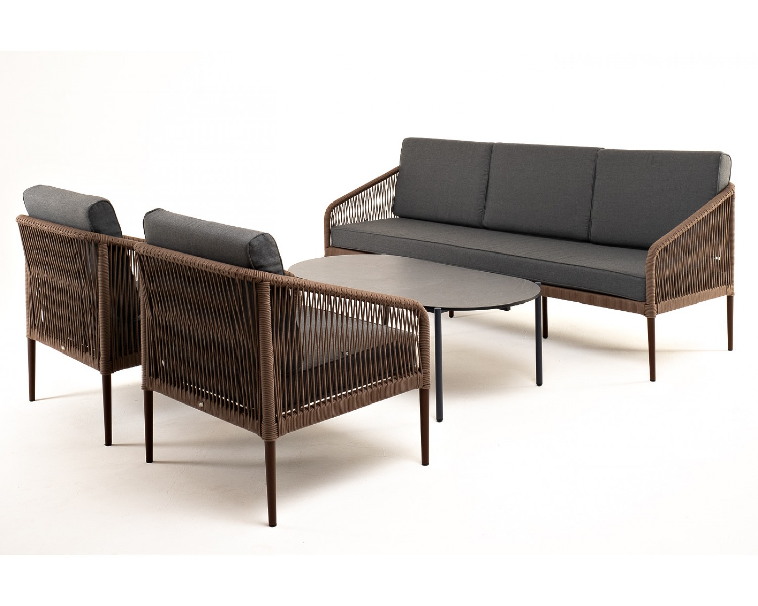 Лаунж-зона «Канны» на пять персон состоит из: - два плетеных кресла (размер – 700×700×750 мм). - трехместный диван (размер – 2030×700×750 мм). - журнальный столик (размер – 1200×650×400 мм). Каркас уличной мебели выполнен из износостойкого алюминия. Его дополняет коричневая ручная оплетка, изготовленная на основе эластичных синтетических лент из полиэфирных волокон высокой прочности. Кресла и диван идут в комплекте с мягкими подушками в чехлах темно-серого цвета.