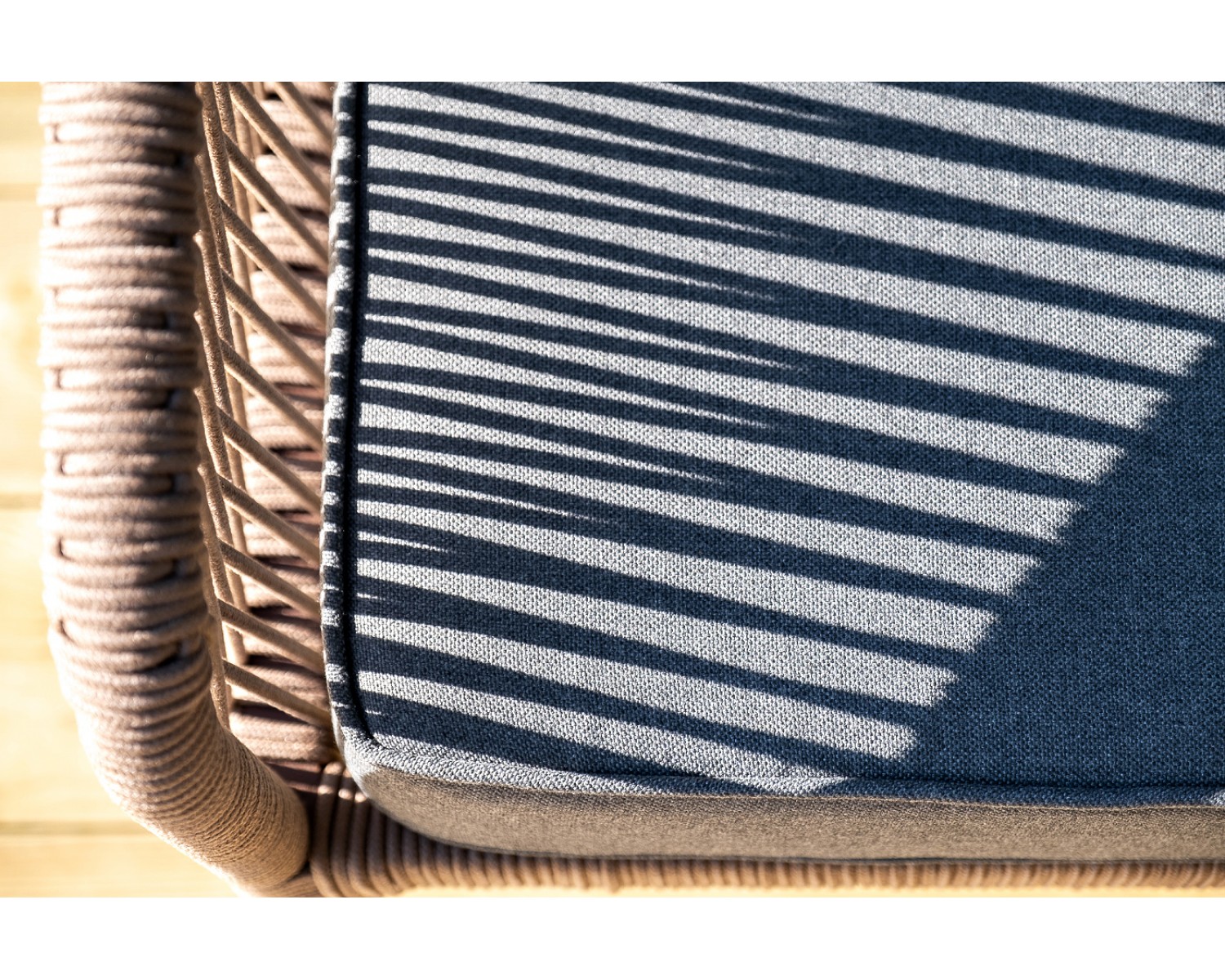 "Милан" диван 3-местный плетеный из роупа, каркас алюминий белый муар, роуп бежевый круглый, ткань бежевая 052