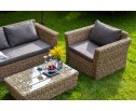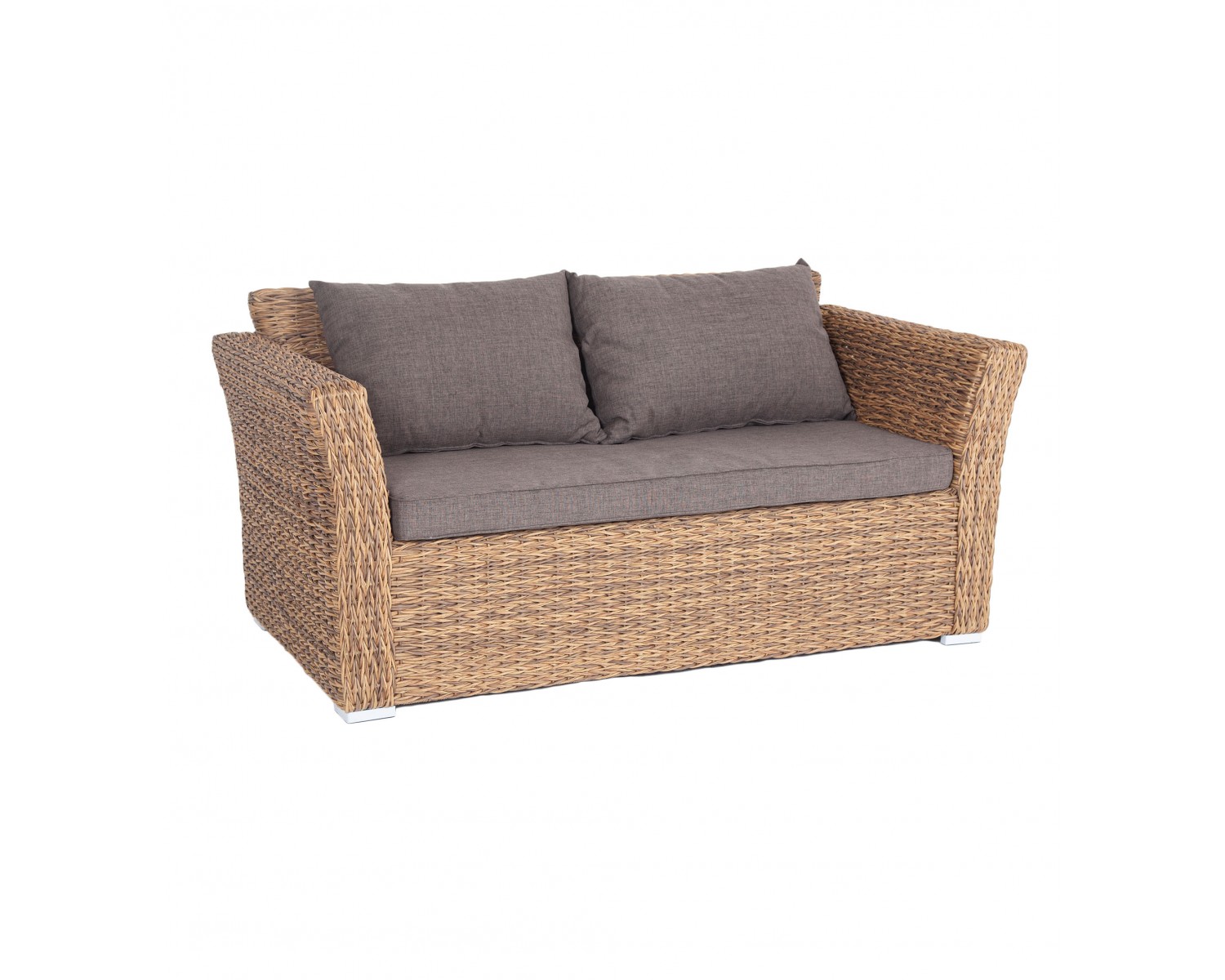 Диван «Капучино» двухместный с каркасом из прочного алюминия. Размер модели – 1700×865×815 мм. Диван выполнен из искусственного ротанга вида «гиацинт» соломенного цвета, оплетенного вручную. Двухместный диван дополнен несколькими подушками со съёмными серо-коричневыми чехлами. Они изготовлены из прочного полиэстера, плотность которого достигает 230гр/м2. Предусмотрена влагоотталкивающая пропитка ткани для защиты текстильных изделий от намокания.