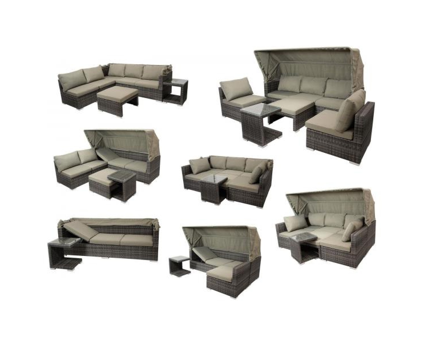 В составе комплекта: Диван с тентом, три модуля, маленький столик и обеденный стол. Высококачественная лоза из полиротанга  бежевого цвета стойкая к любым атмосферным явлениям. Крепкий стальной каркас с полимерным антивандальным покрытием и отличным качеством сварки. Изделие сплетено вручную нашими мастерами под жестким контролем качества на каждом этапе производства. Лоза максимально приближена по рельефу и текстуре к естественному материалу. Идеально подходит для использования на улице и внутри помещения в любую погоду. Не боится воды, солнца и минусовой температуры. Декоративные подушки не предусмотрены в комплекте.