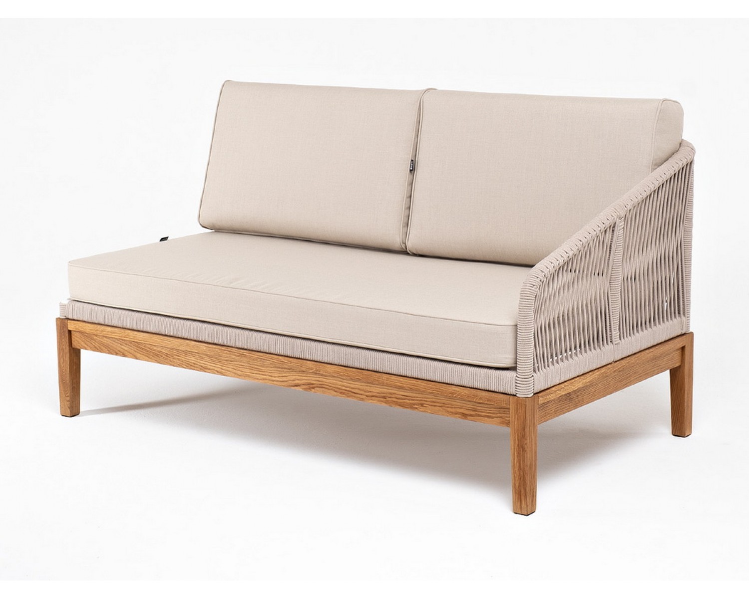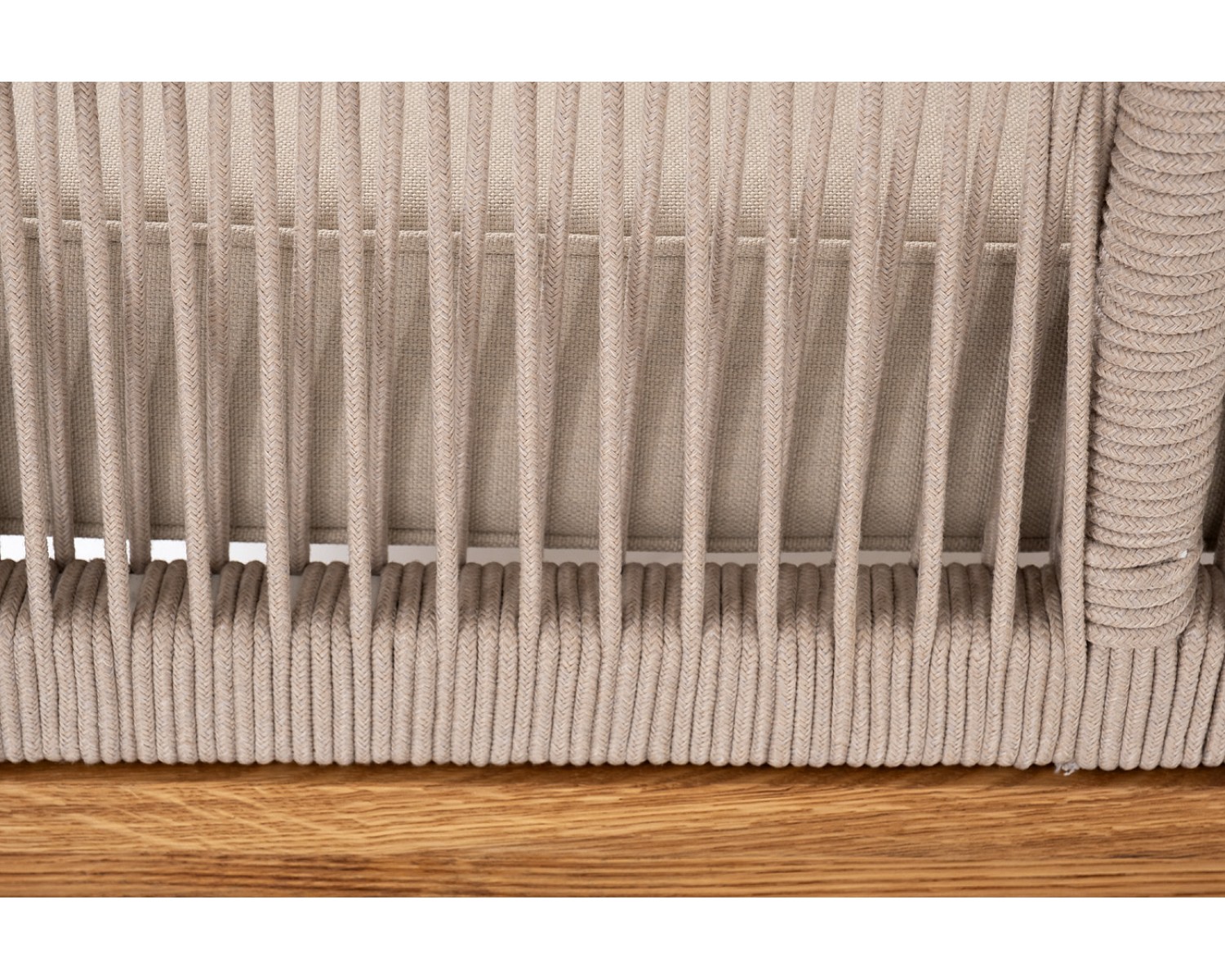 Диванный модуль «Канны» левосторонний из комплекта трансформирующегося одноименного дивана. Боковины каркаса вручную оплетены роупом - эластичными синтетическими лентами, изготовленными из высокопрочных полиэфирных волокон. Цвет оплетки - бежевый. Основание дуб. Подушки состоят из наполнителя и съёмных чехлов. Материал - 100% полиэстер, плотностью 300гр/м2. Размер плетеного модуля: 1480×850×790 мм.