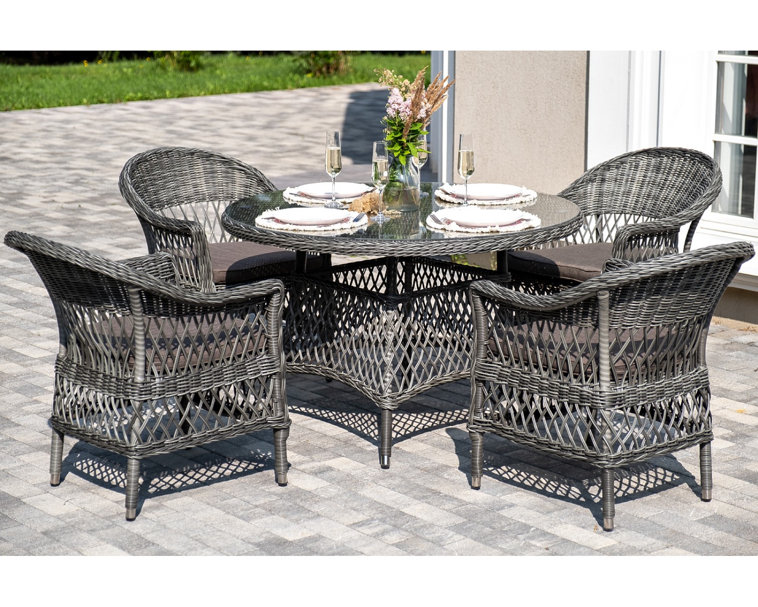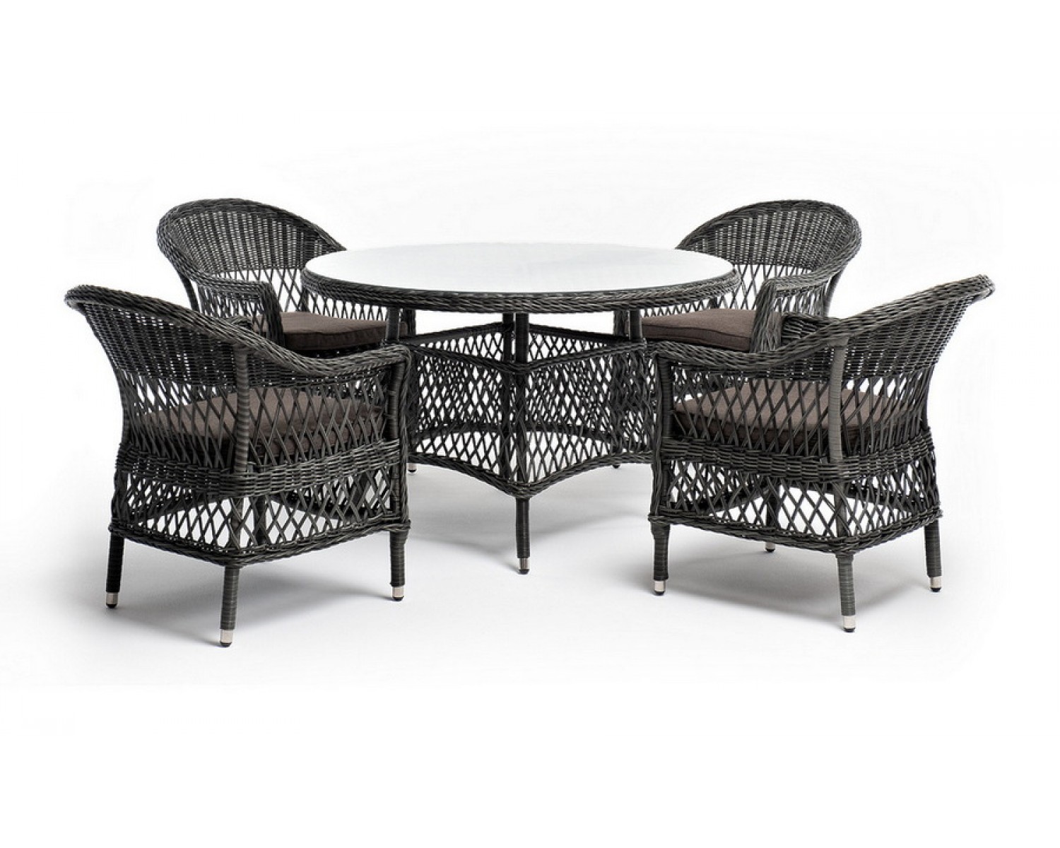 Уличная обеденная группа «Дольче» для обустройства зоны отдыха. В комплект входит: - круглый обеденный стол «Эспрессо» (1180×1180×750 мм) с ударопрочной стеклянной столешницей; - 4 кресла из коллекции «Сицилия» (590×640×820 мм). Вся мебель изготовлена из алюминия, поэтому ее очень легко перемещать. Декоративное покрытие выполнено из долговечного искусственного ротанга, устойчивого к перепадам температур и переменам погоды. Столешница изготовлена из прочного закаленного стекла 5 мм, кресла укомплектованы подушками серо-коричневого цвета со съёмными чехлами.