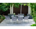 Обеденная группа «Милан» рассчитана на 6 персон. В комплект входят: - обеденный стол «Руссо» - 1500×800×750 мм. - 6 стульев «Марсель» - 570×620×775 мм. Столешница стола выполнена из высококачественного монолитного компакт-пластика HPL. Его толщина - 12 мм, цвет - молочный, ножки - из металла белого цвета. Каркас стульев белого цвета - алюминиевый, оплетен вручную современным материалом - роупом светло-серого оттенка. Это эластичные синтетические ленты из высокопрочных полиэфирных волокон. В комплект входят подушки со съёмными водоотталкивающими чехлами.