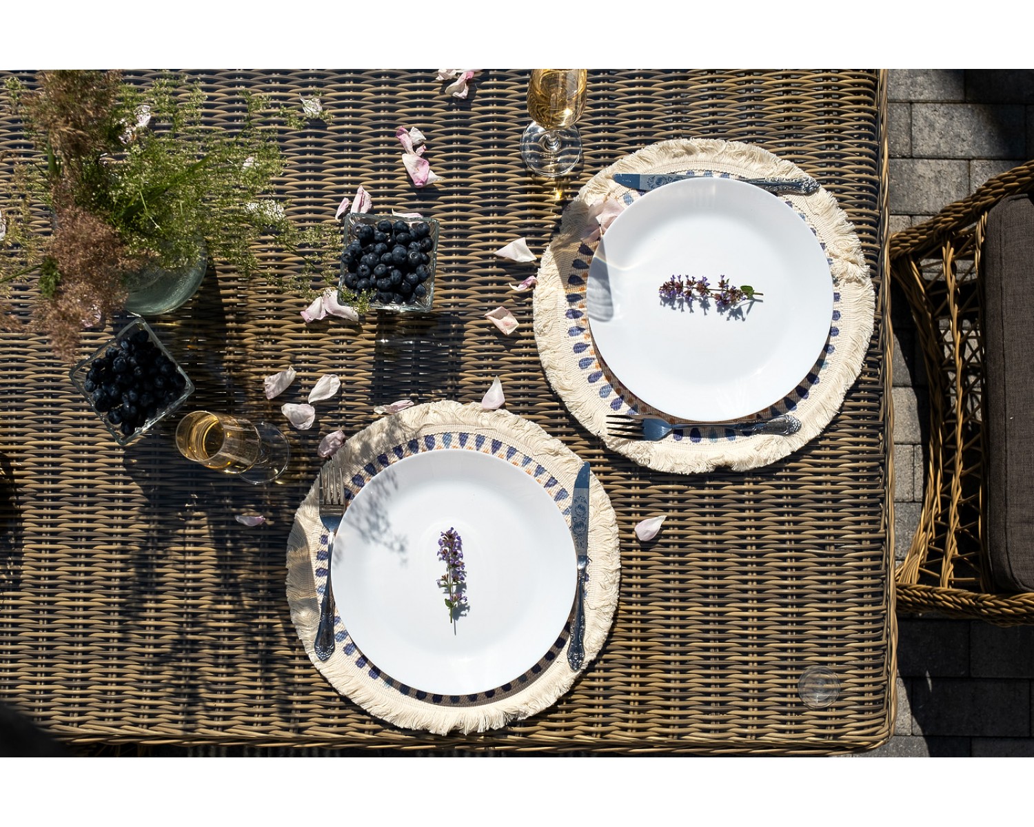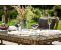 Садовая обеденная группа на 6 персон «Цесена» из ротанга. В комплекте: большой прямоугольный обеденный стол (1600×900×750 мм) и 6 кресел (600×800×910 мм). Вся мебель изготовлена из алюминия, вручную оплетенного круглым искусственным ротангом натурального соломенного оттенка. Столешница укомплектована ударопрочным стеклом, толщиной 5 мм. Данное стекло крепится к столу при помощи четырех вакуумных силиконовых присосок и поставляется в собранном виде.
