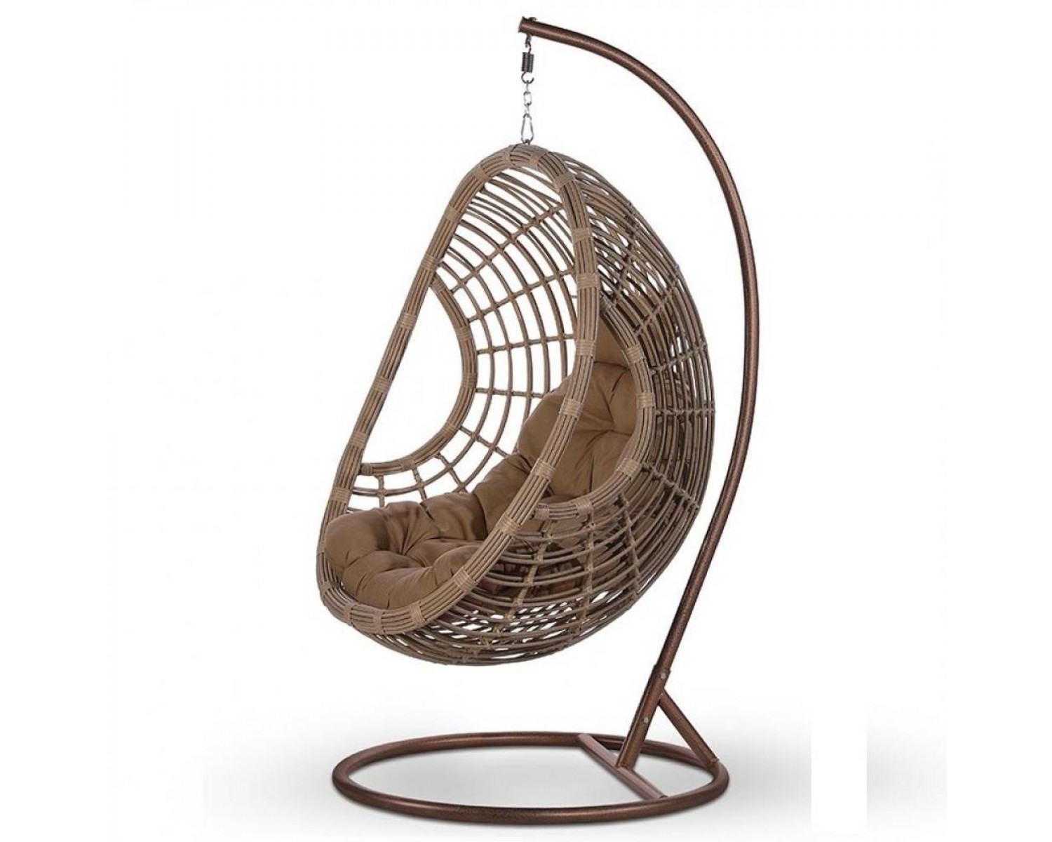 Размер корзины: 124х98х72 см Стойка: H2,0xD1,0 м, Каркас сталь. Материал плетения на корзине: искусственный ротанг бежевого цвета. Подушка бежевая. Ткань с водоотталкивающей пропиткой. Допустимая нагрузка: 120 кг.