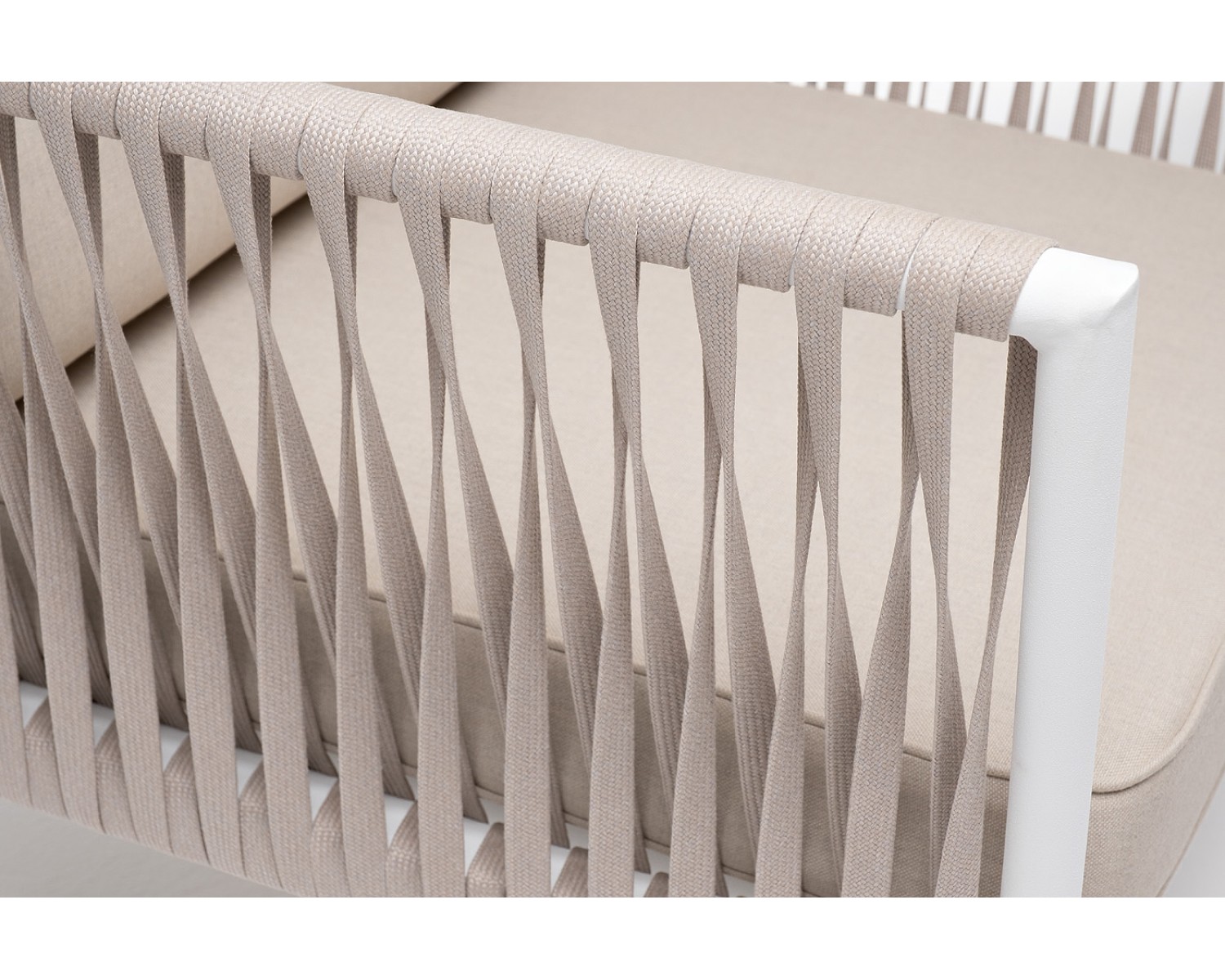 Плетеное кресло "Касабланка" с подушками в комплекте. Кресло имеет алюминиевый каркас, окрашенный порошковой краской белового цвет. Боковины каркаса вручную оплетены роупом - эластичными синтетическими лентами, изготовленными из высокопрочных полиэфирных волокон. Цвет оплетки - бежевый. Подушки состоят из наполнителя и съёмных чехлов, которые обработаны влагоотталкивающей пропиткой бежевого цвета. Чехол можно стирать в стиральной машине с использованием порошков. Размер кресла: 900×800×695 мм.