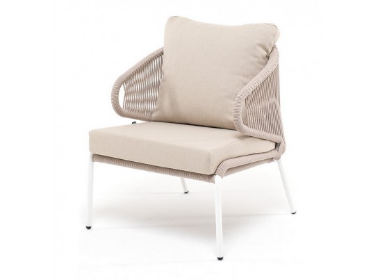 "Милан" кресло плетеное из роупа, каркас алюминий белый муар, роуп бежевый круглый, ткань бежевая 052 в Каменске-Уральском