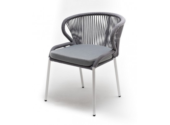 Стул «Милан» для обустройства обеденной или лаунж-зоны. Изготовлен из алюминиевого каркаса, оплетенного вручную эластичными синтетическими лентами из высокопрочных полиэфирных волокон (роуп круглый). Цвет каркаса - белый, оплетки - светло-серый. В комплект входит подушка со съёмным чехлом из 100%-го полиэстера с влагоотталкивающей пропиткой. Размеры плетеного стула: 600×660×795 мм.