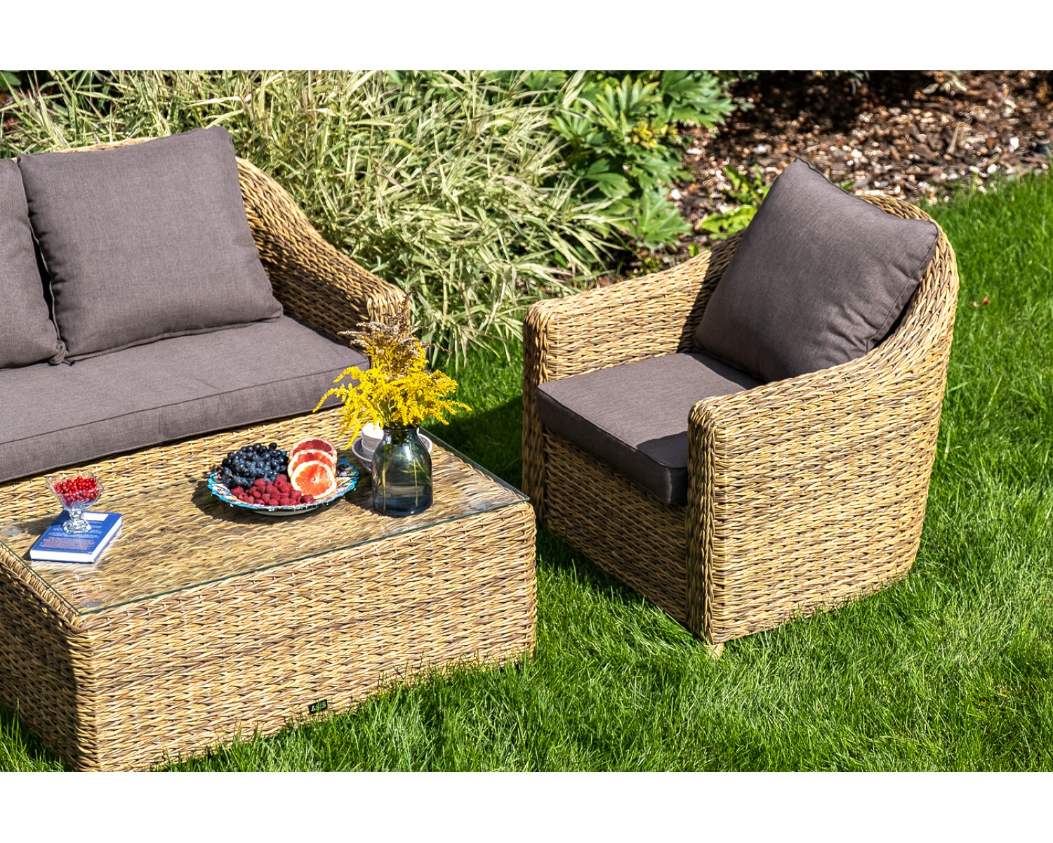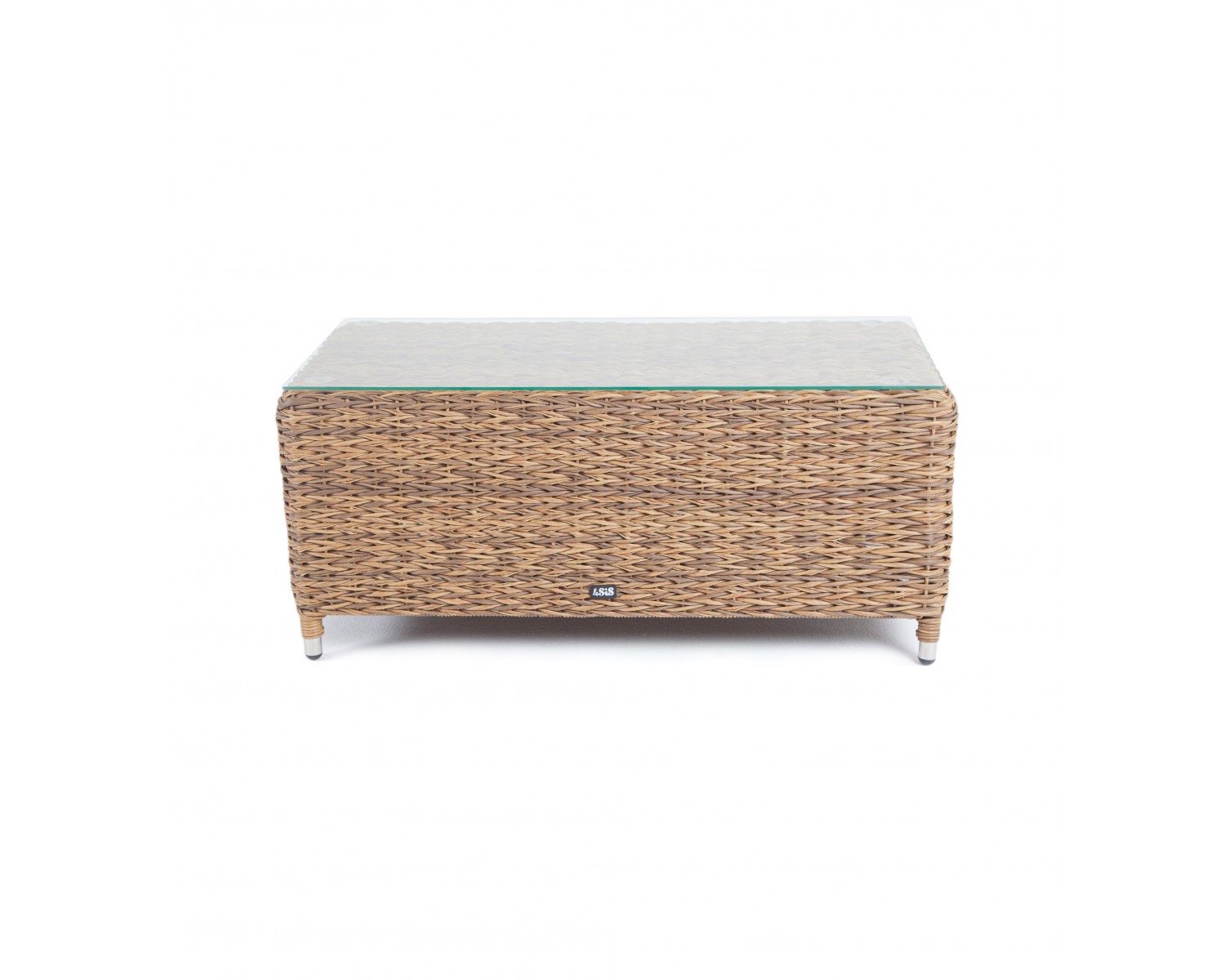 Журнальный столик из искусственного ротанга «Кон Панна» соломенного цвета, подходит для эксплуатации при различных погодных условиях. Вид плетения - "гиацинт". Модель оснащена прочным каркасом, изготовленным из алюминия. В качестве столешницы используется ударопрочное стекло толщиной 5 мм. Размеры: 1000×500×420 мм.